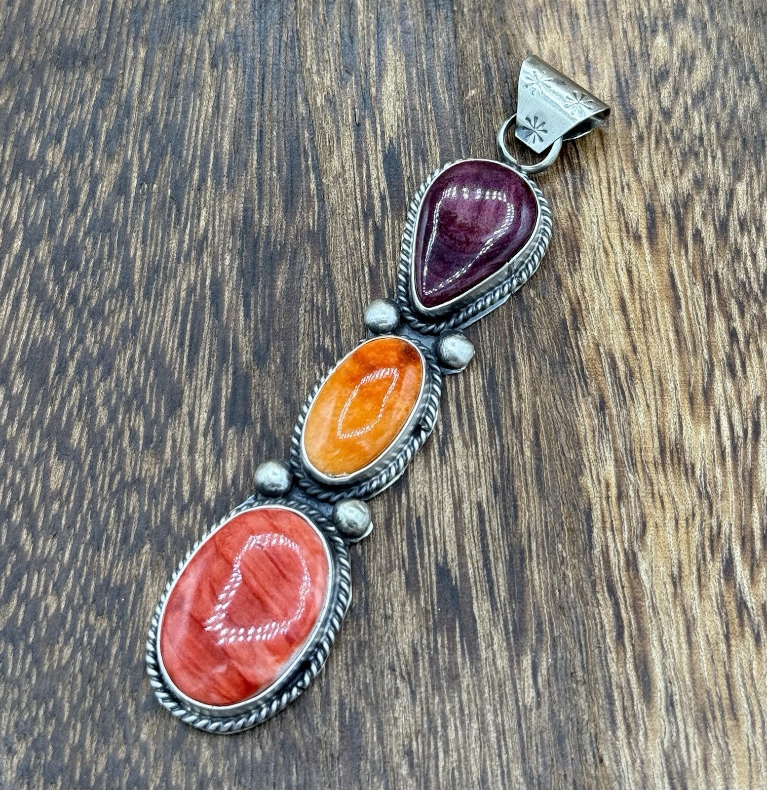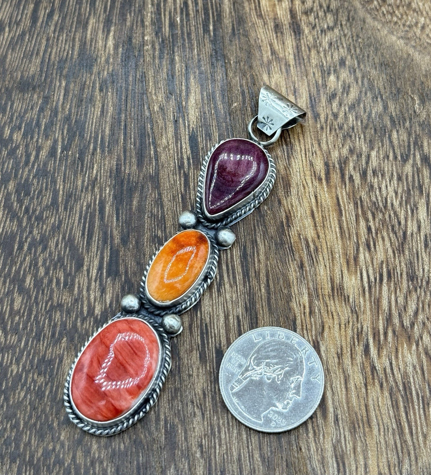 Native Navajo Handmade Sterling Silver Multi Spiny Oyster Shell Drop Pendant
