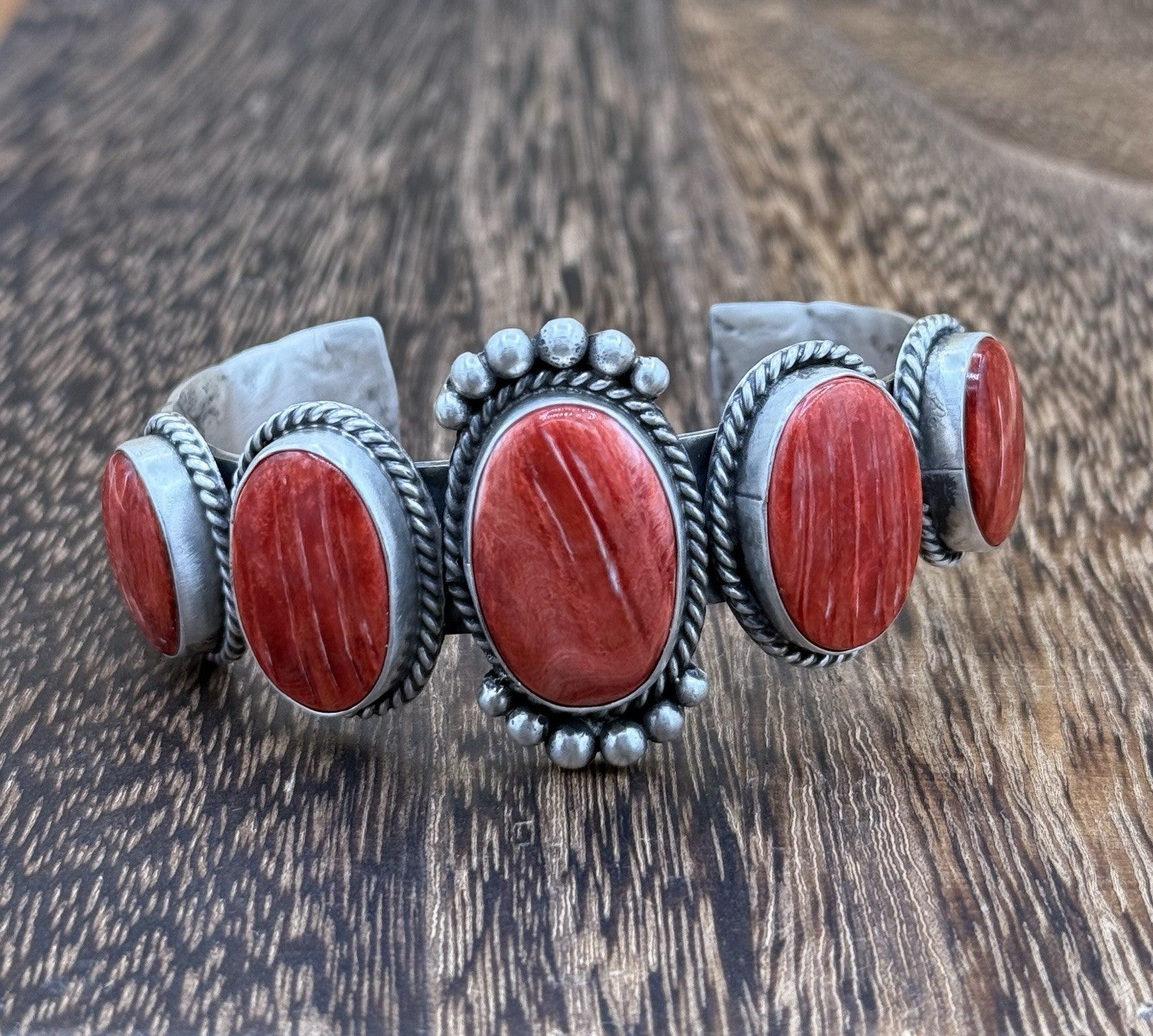 Native Navajo Handmade Sterling Silver Red Spiny Oyster Shell Cuff Bracelet