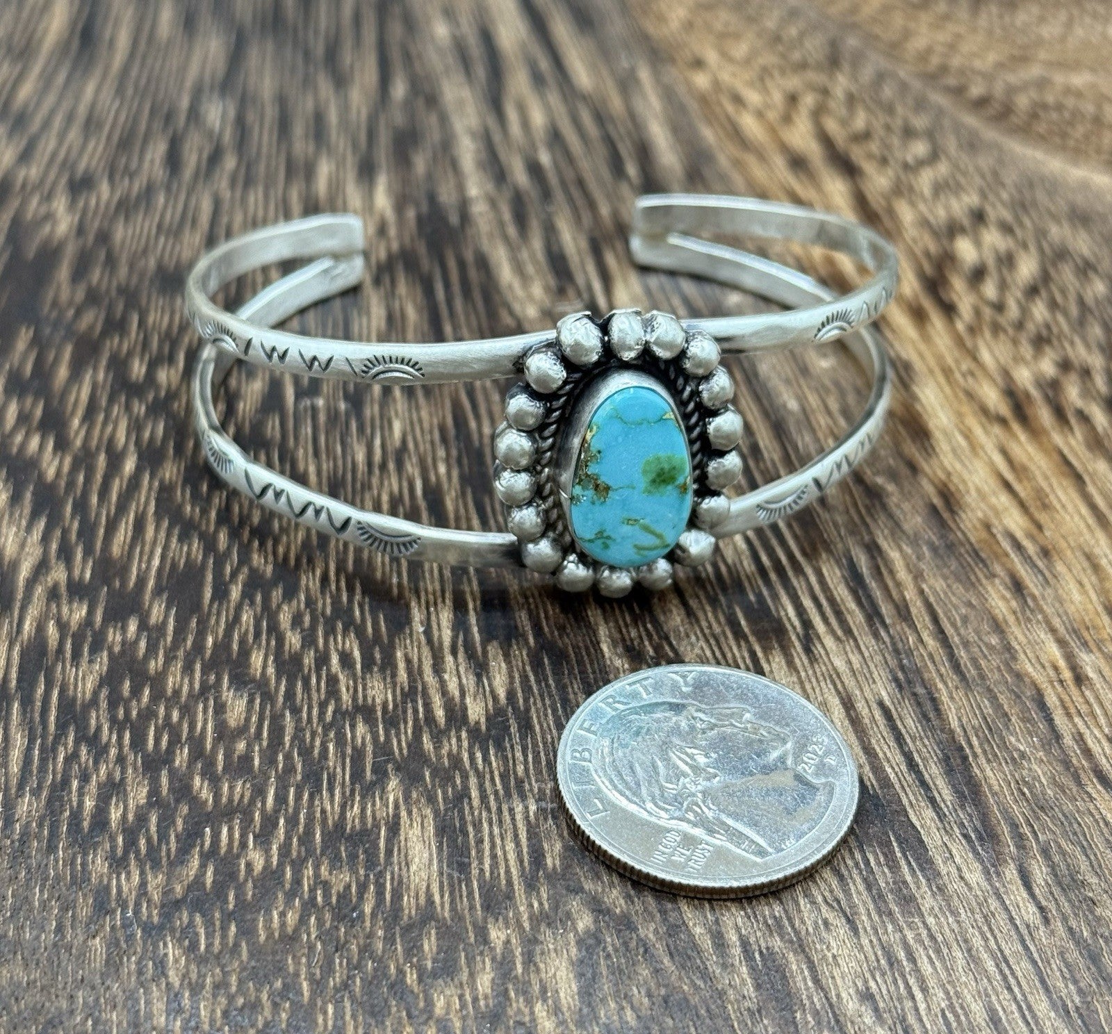 This Native American Navajo handmade cuff bracelet a features beautiful sonoran gold turquoise stones. The intricate design and attention to detail make this bracelet a true beauty. The Navajo tribal affiliation adds to the authenticity and uniqueness of this piece.