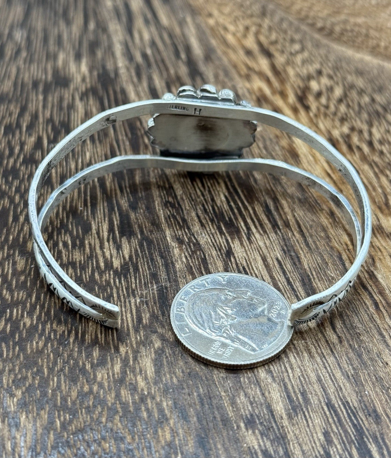 This Native American Navajo handmade cuff bracelet a features beautiful sonoran gold turquoise stones. The intricate design and attention to detail make this bracelet a true beauty. The Navajo tribal affiliation adds to the authenticity and uniqueness of this piece.