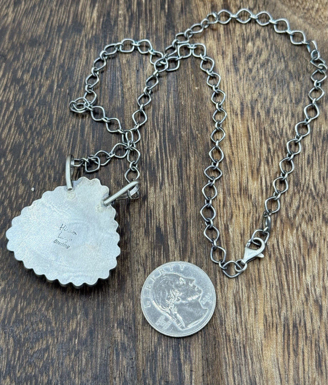 This exquisite cluster necklace is a true work of art handcrafted by Native American artisan Hiram Largo, The stunning necklace features a beautiful high grade Sonoran Gold Turquoise stone set in .925 sterling silver. The pendant hangs on an 18-inch chain with lobster closure, making it a perfect accessory for any occasion.