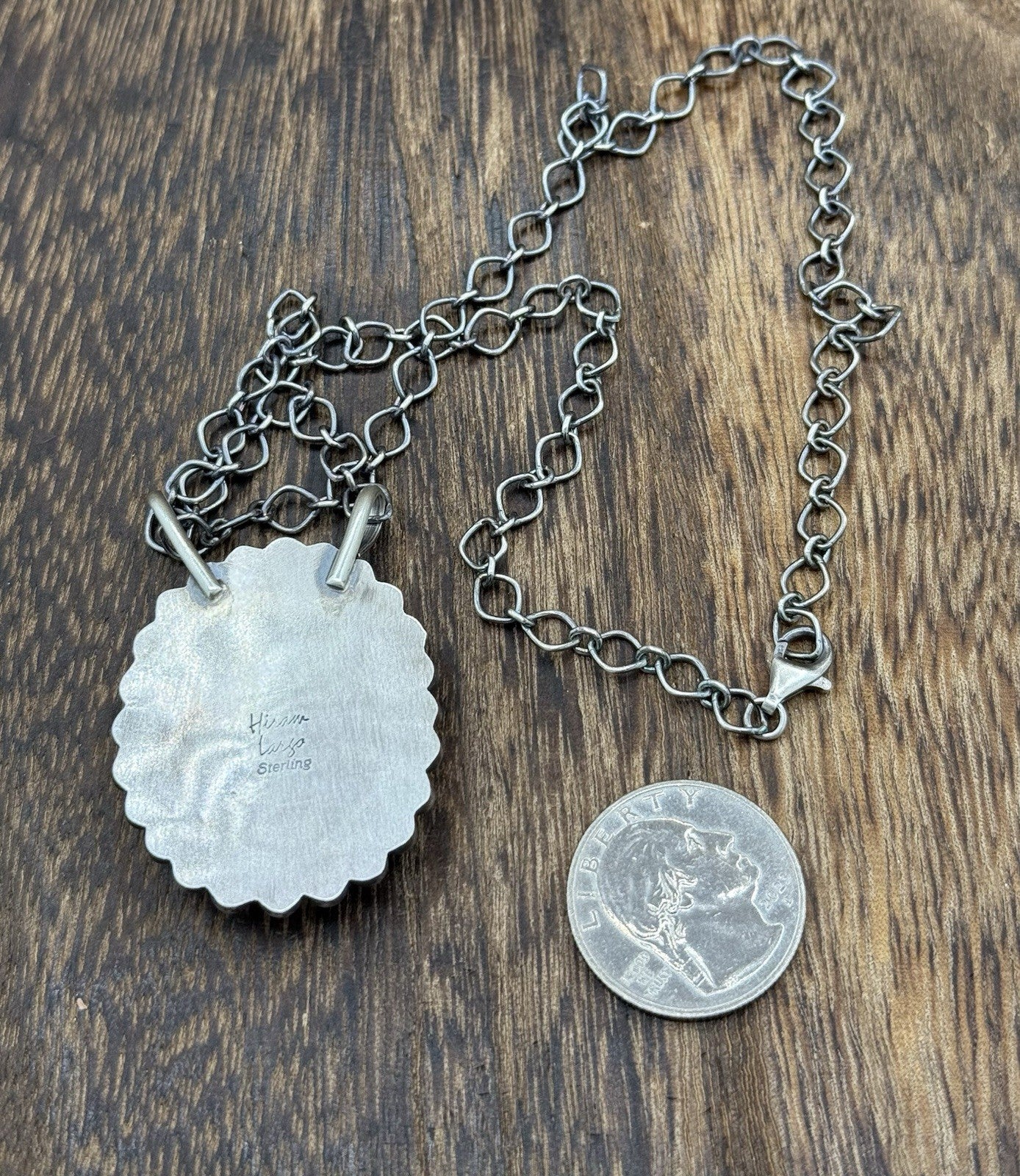 This exquisite cluster necklace is a true work of art handcrafted by Native American artisan Hiram Largo, The stunning necklace features a beautiful high grade Sonoran Gold Turquoise stone set in .925 sterling silver. The pendant hangs on an 18-inch chain with lobster closure, making it a perfect accessory for any occasion.