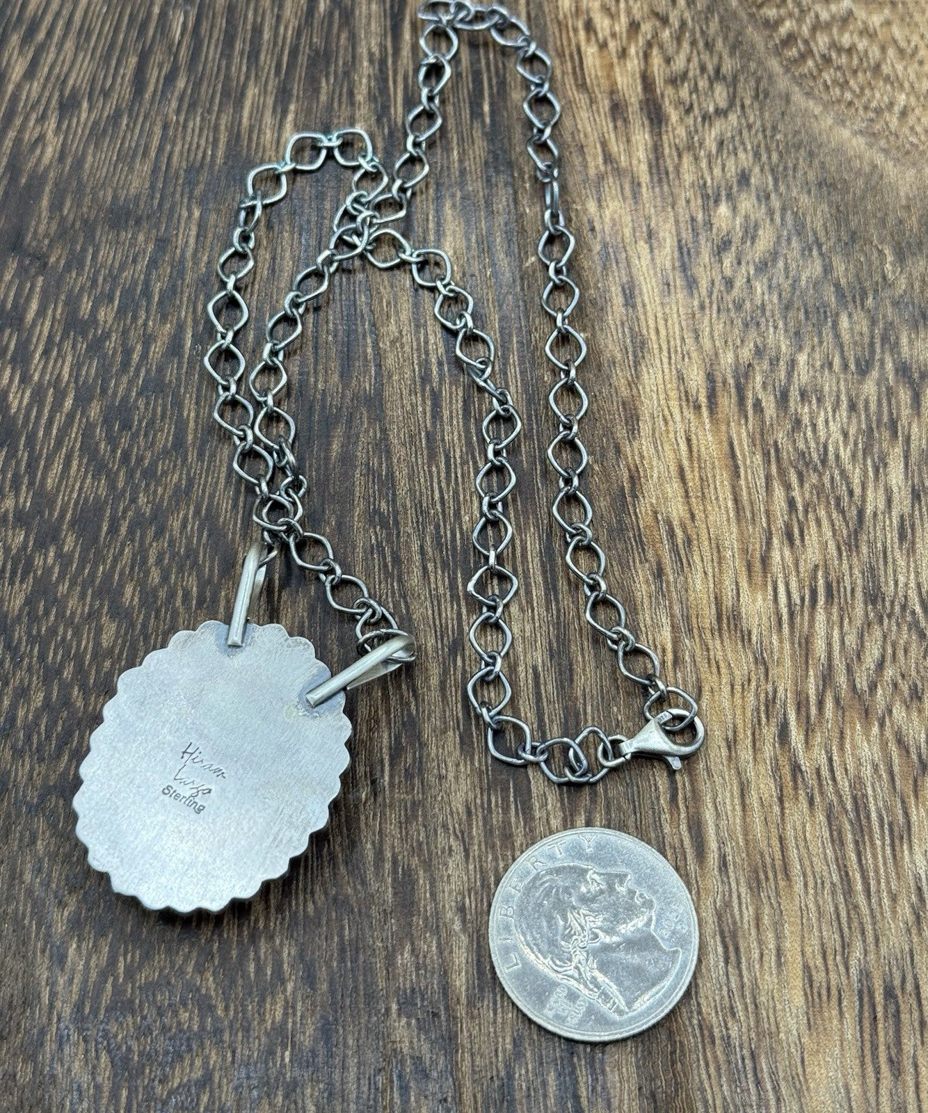 This exquisite cluster necklace is a true work of art handcrafted by Native American artisan Hiram Largo, The stunning necklace features a beautiful high grade Sonoran Gold Turquoise stone set in .925 sterling silver. The pendant hangs on an 18-inch chain with lobster closure, making it a perfect accessory for any occasion.