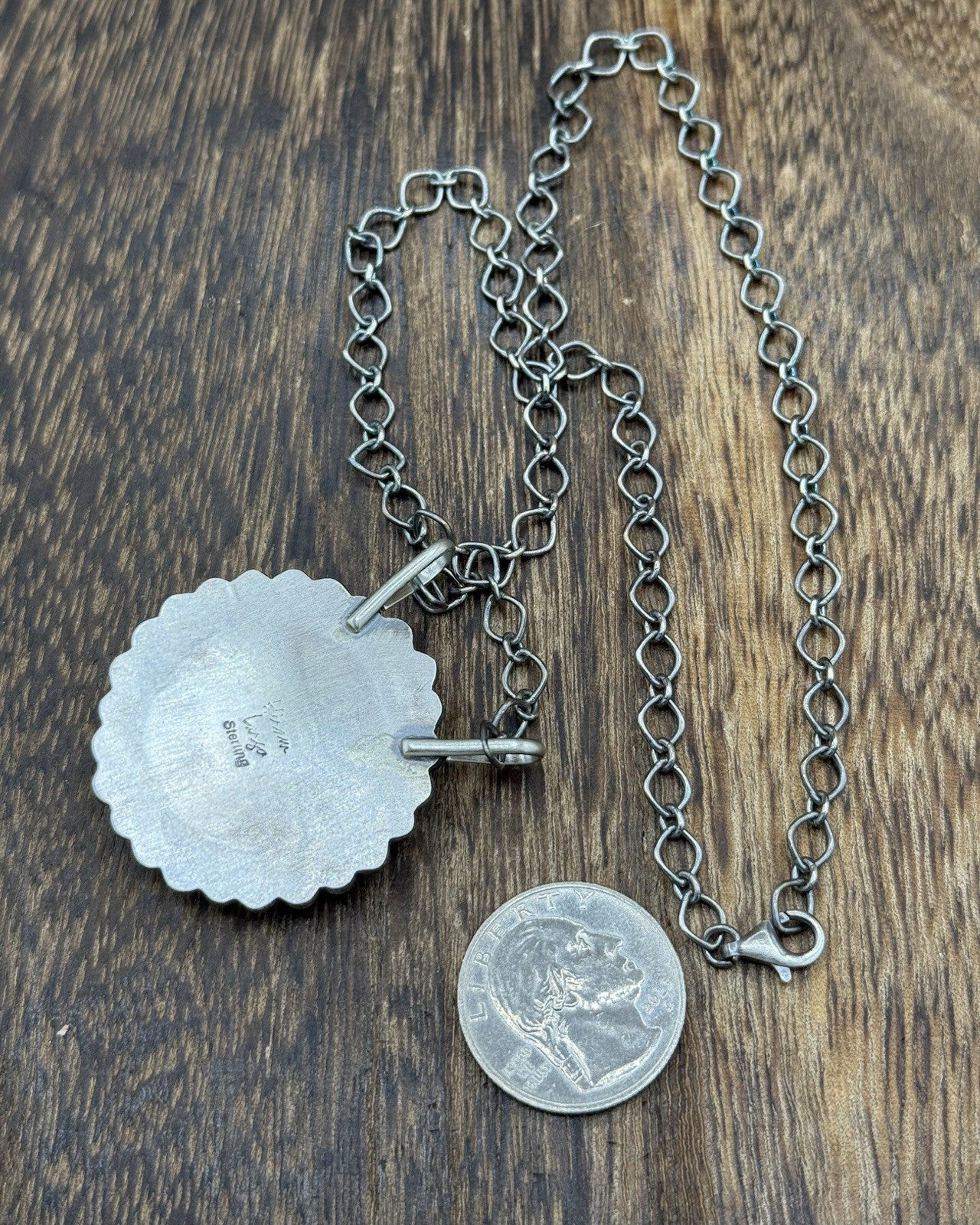 This exquisite cluster necklace is a true work of art handcrafted by Native American artisan Hiram Largo, The stunning necklace features a beautiful high grade Sonoran Gold Turquoise stone set in .925 sterling silver. The pendant hangs on an 18-inch chain with lobster closure, making it a perfect accessory for any occasion.