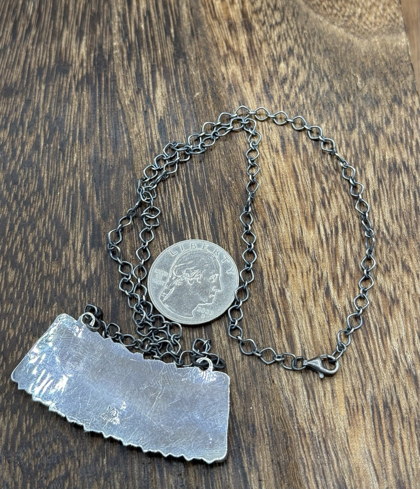 This exquisite necklace is a true work of art handcrafted by Native American artisan Mathilda Benally, The stunning cluster bar shaped necklace features beautiful block Turquoise stones set in sterling silver bezel. The pendant hangs on an 18-inch chain with lobster closure, making it a perfect accessory for any occasion.