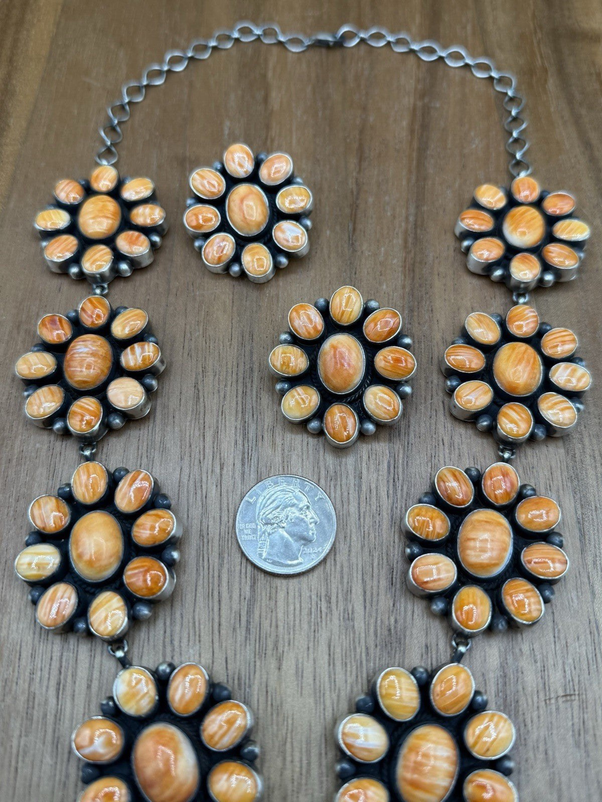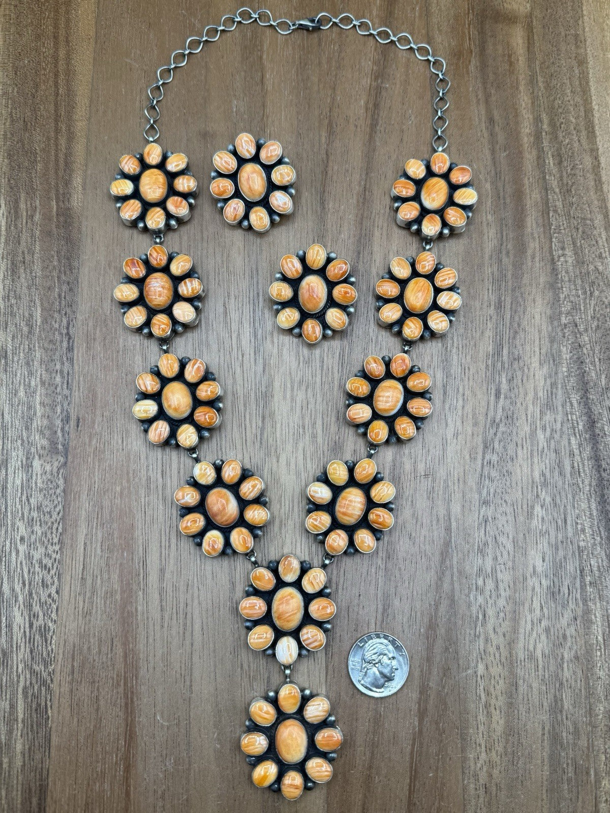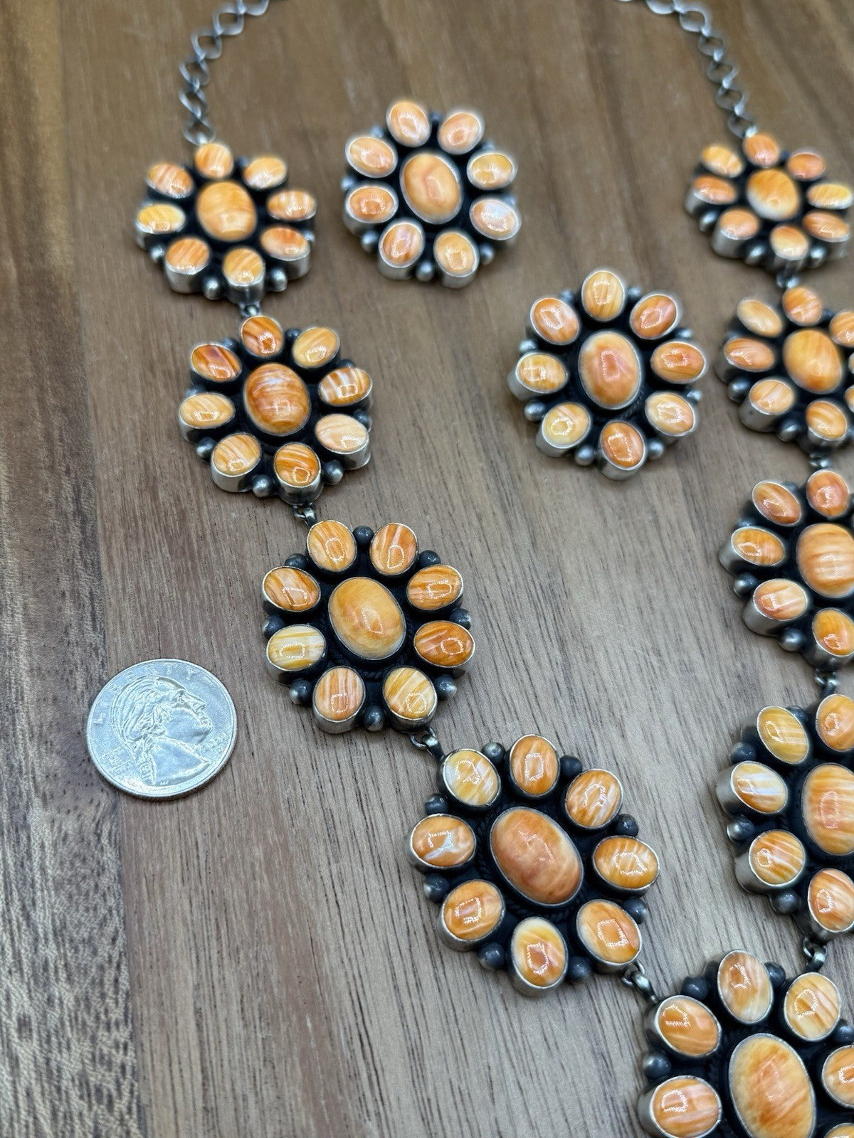 Navajo Handmade Silver Orange Spiny Oyster Cluster Lariat Dangle Necklace 24”