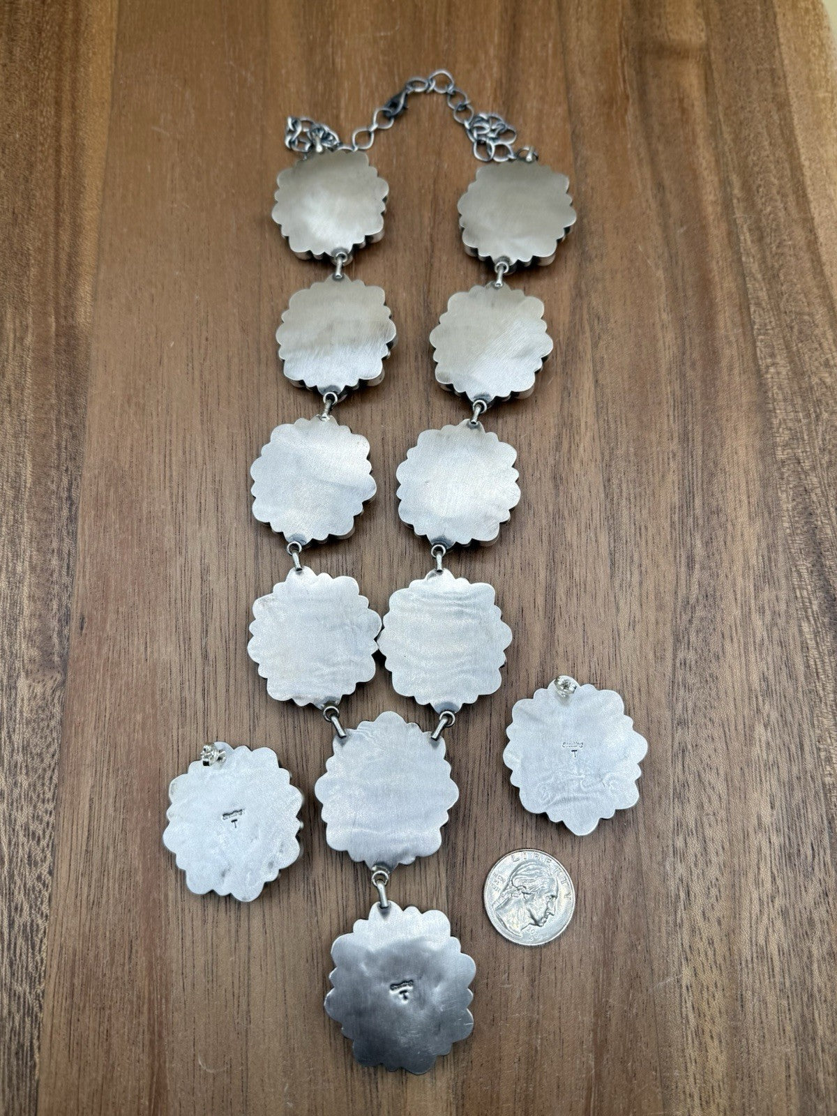 The necklace is handmade with natural orange spiny oyster shell stones and .925 sterling silver, and it is signed by Navajo artist Tricia Smith. The link chain adds to its beauty and western art theme. This statement piece is a must-have for anyone who loves ethnic and regional style. Get ready to make a statement with this unique and beautiful necklace.