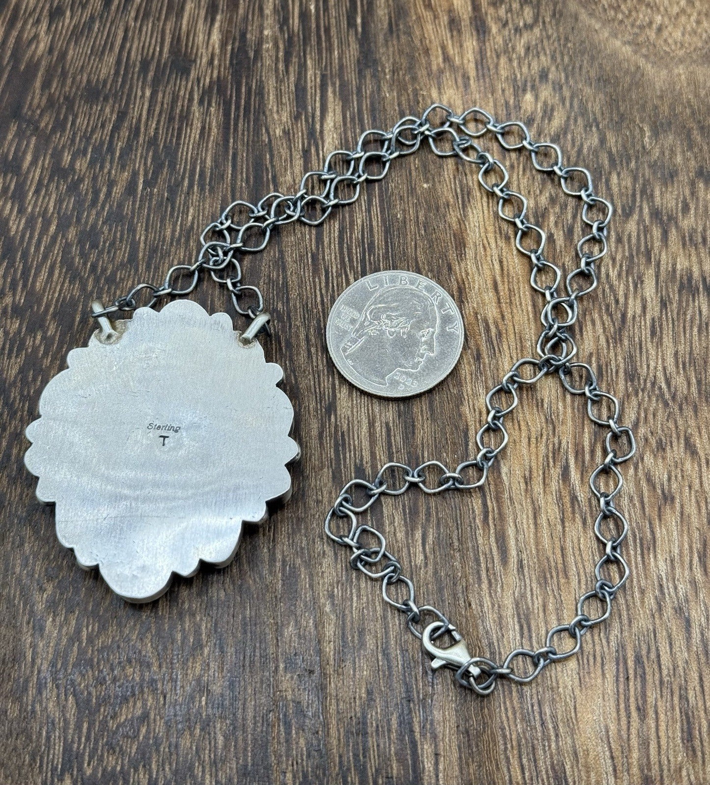 This exquisite cluster necklace is a true work of art handcrafted by Native American artisan Tricia Smith, The stunning cluster shaped necklace features beautiful natural Sonoran Gold Turquoise stones set in .925 sterling silver bezel. The pendant hangs on an 18-inch chain with lobster closure, making it a perfect accessory for any occasion.
