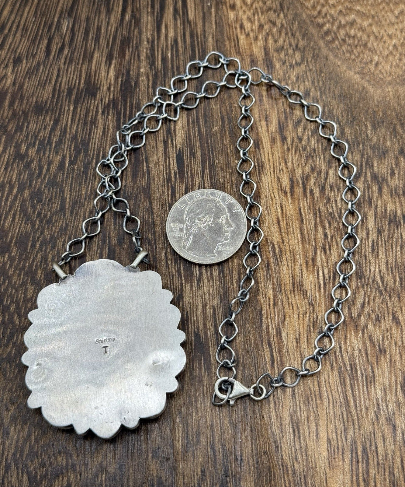 This exquisite cluster necklace is a true work of art handcrafted by Native American artisan Tricia Smith, The stunning cluster shaped necklace features beautiful natural Sonoran Gold Turquoise stones set in .925 sterling silver bezel. The pendant hangs on an 18-inch chain with lobster closure, making it a perfect accessory for any occasion.