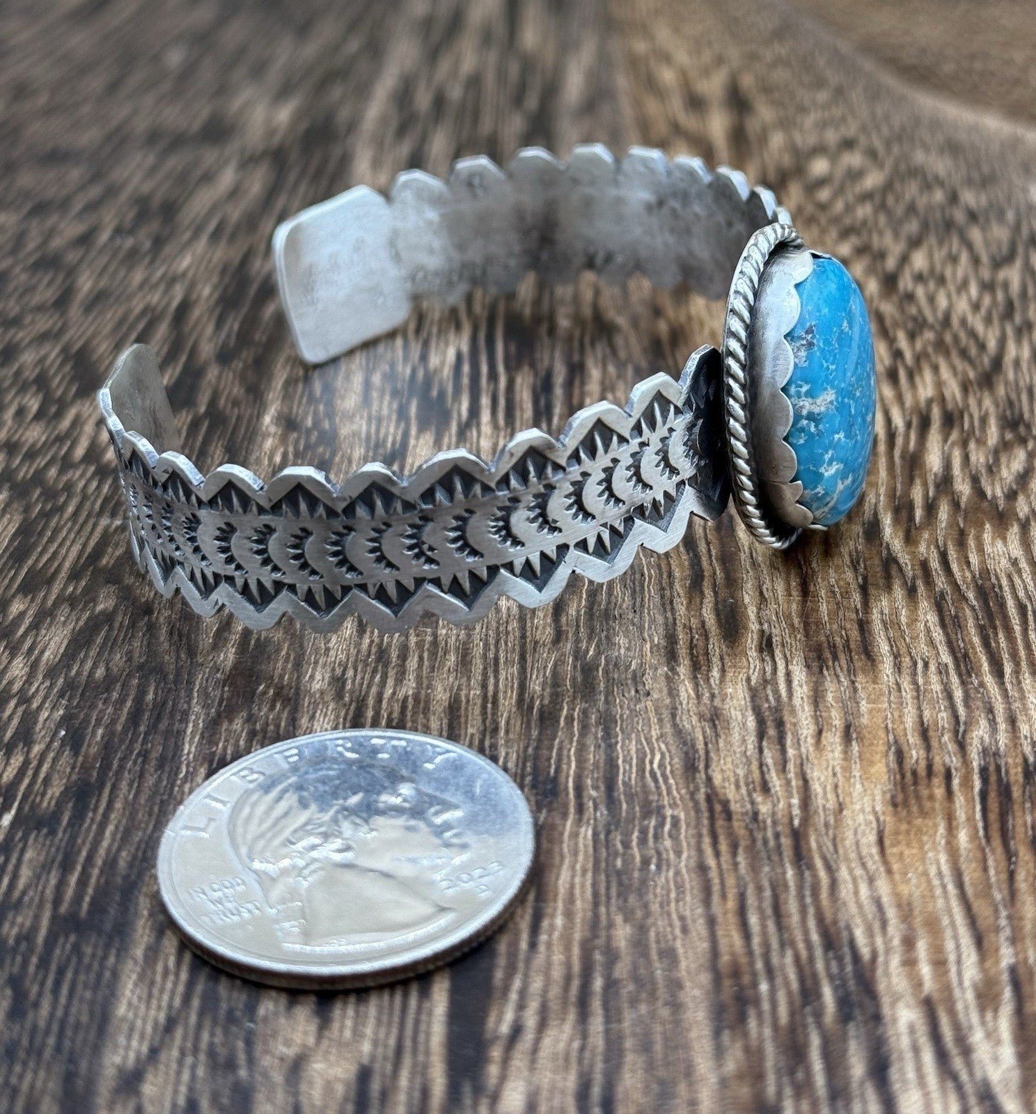 This Native American Navajo handmade cuff bracelet a features beautiful natural blue bird turquoise stone. The intricate design and attention to detail make this bracelet a true beauty. The Navajo tribal affiliation adds to the authenticity and uniqueness of this piece.