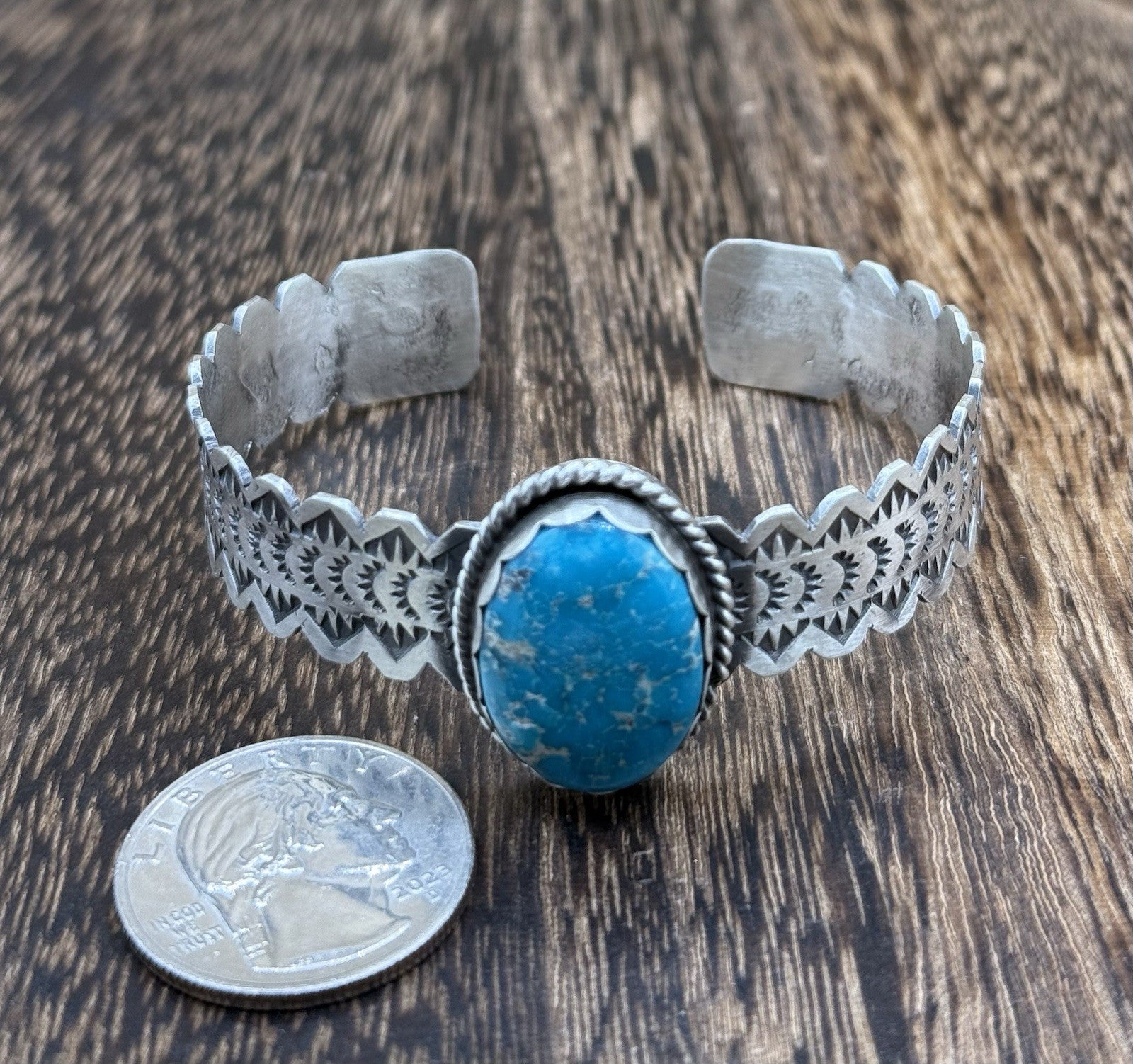 Navajo Handmade Sterling Silver Blue Bird Turquoise Stacker Cuff Bracelet