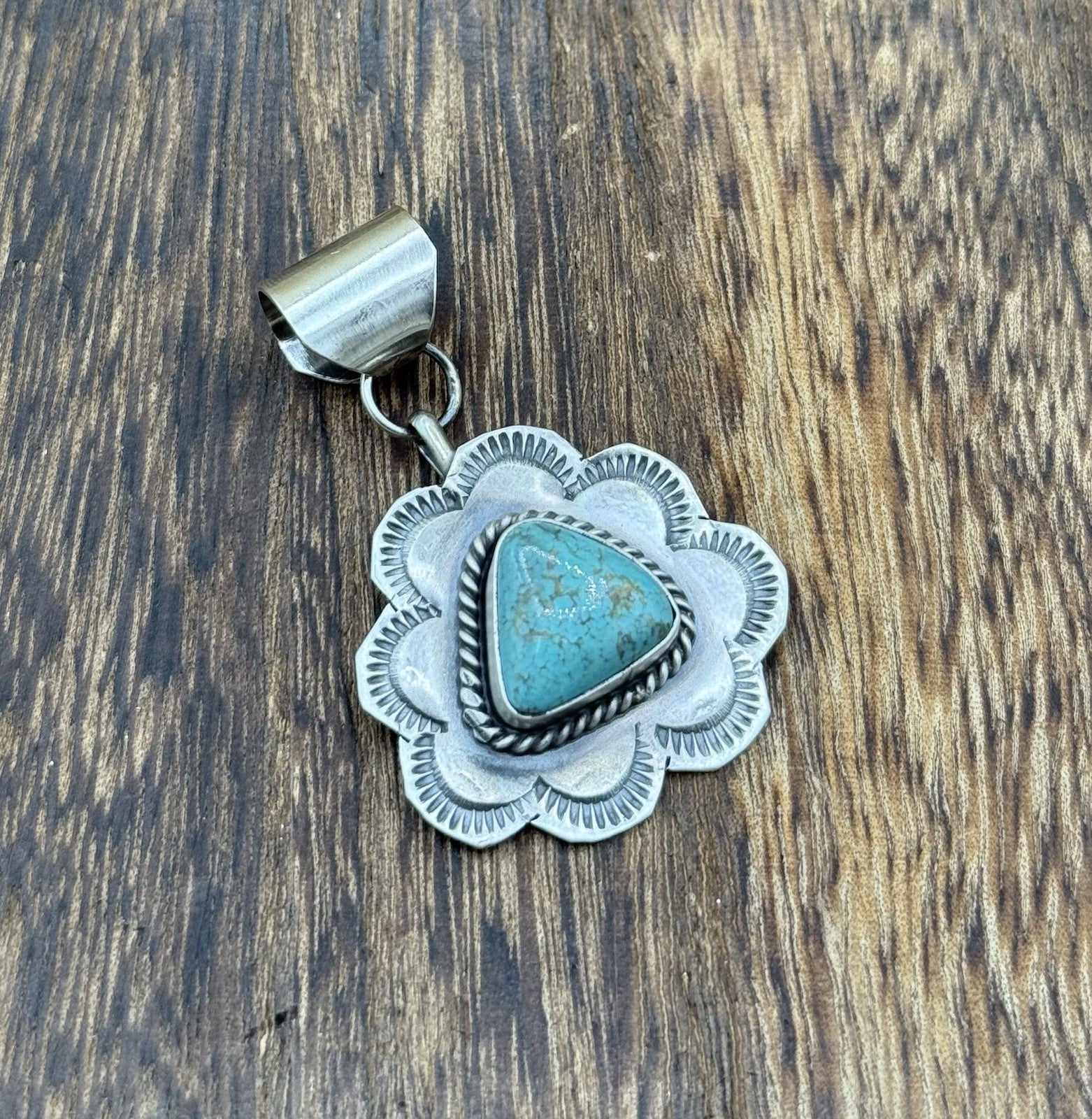 Navajo Handmade Sterling Silver Blue Bird Turquoise Stamped Design Drop Pendant