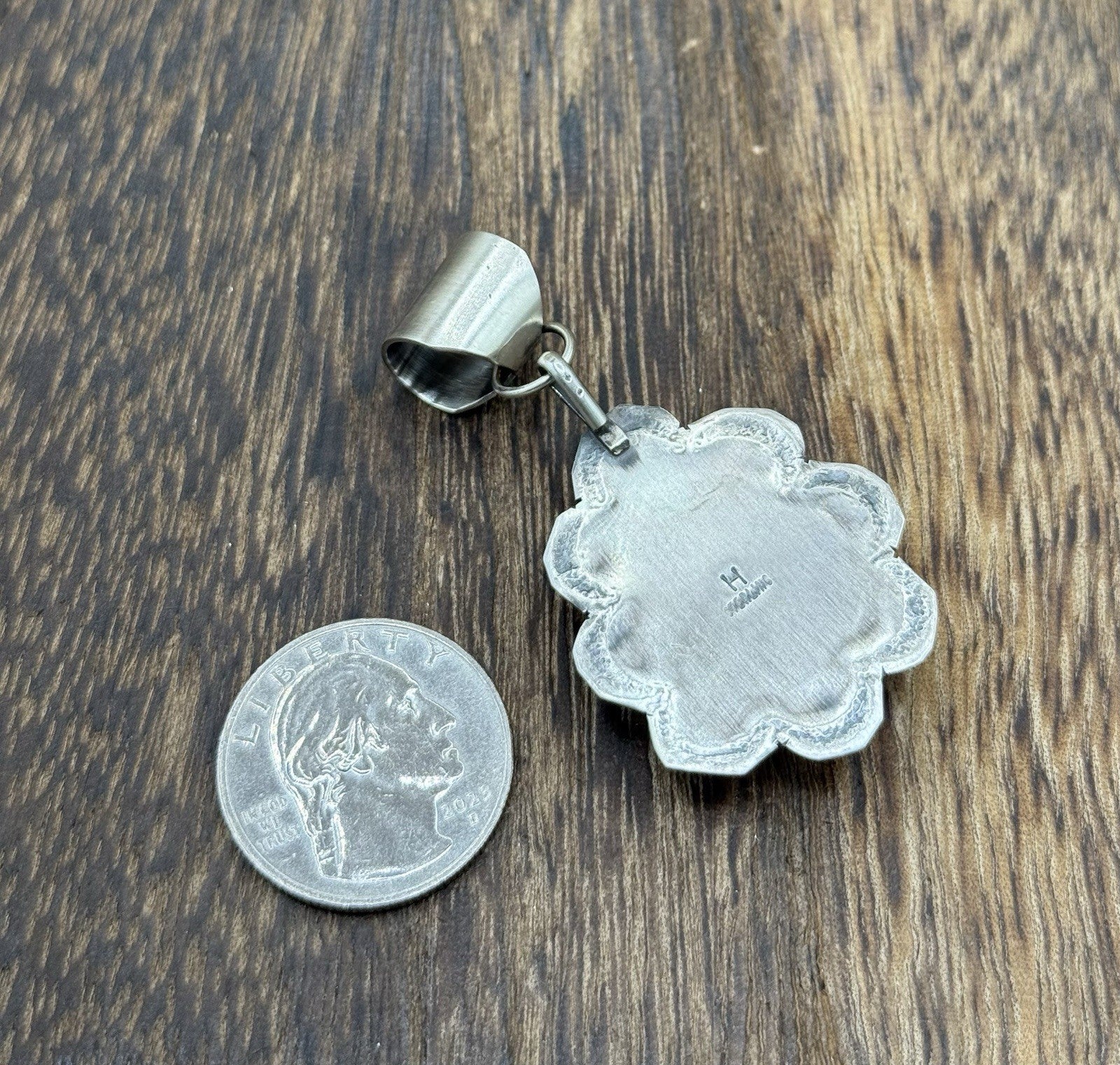 Navajo Handmade Sterling Silver Blue Bird Turquoise Stamped Design Drop Pendant