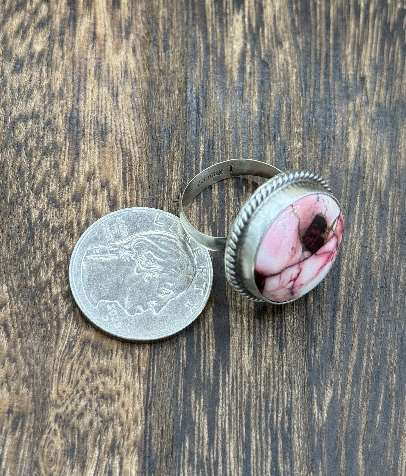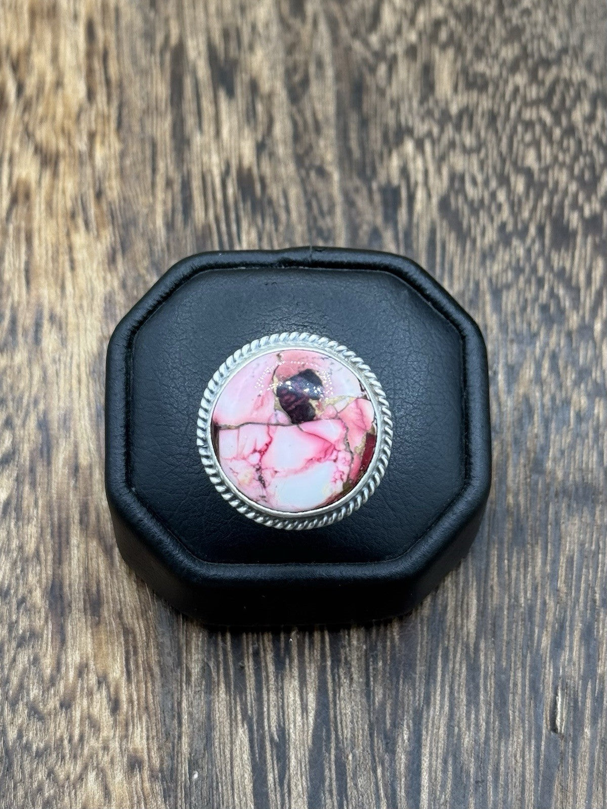 This is a handmade Native american ring made by Tricia Smith. The ring is adorned with Dahlia rose (dyed stone). The ring is adjustable from size 7 to 10