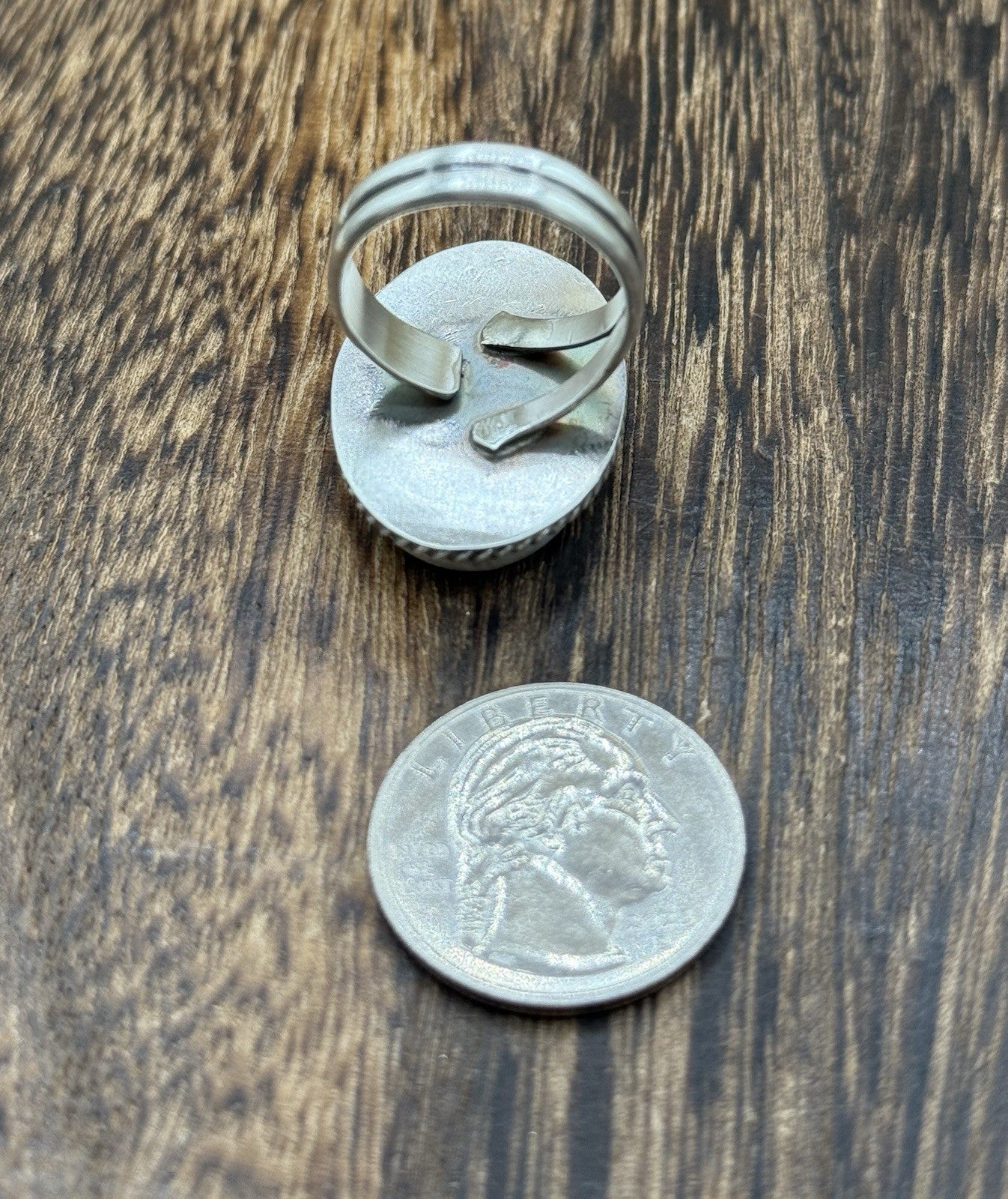 This is a handmade Native american ring made by Tricia Smith. The ring is adorned with dahlia rose (dyed compressed) stone. The ring is adjustable from size 7 to size 10