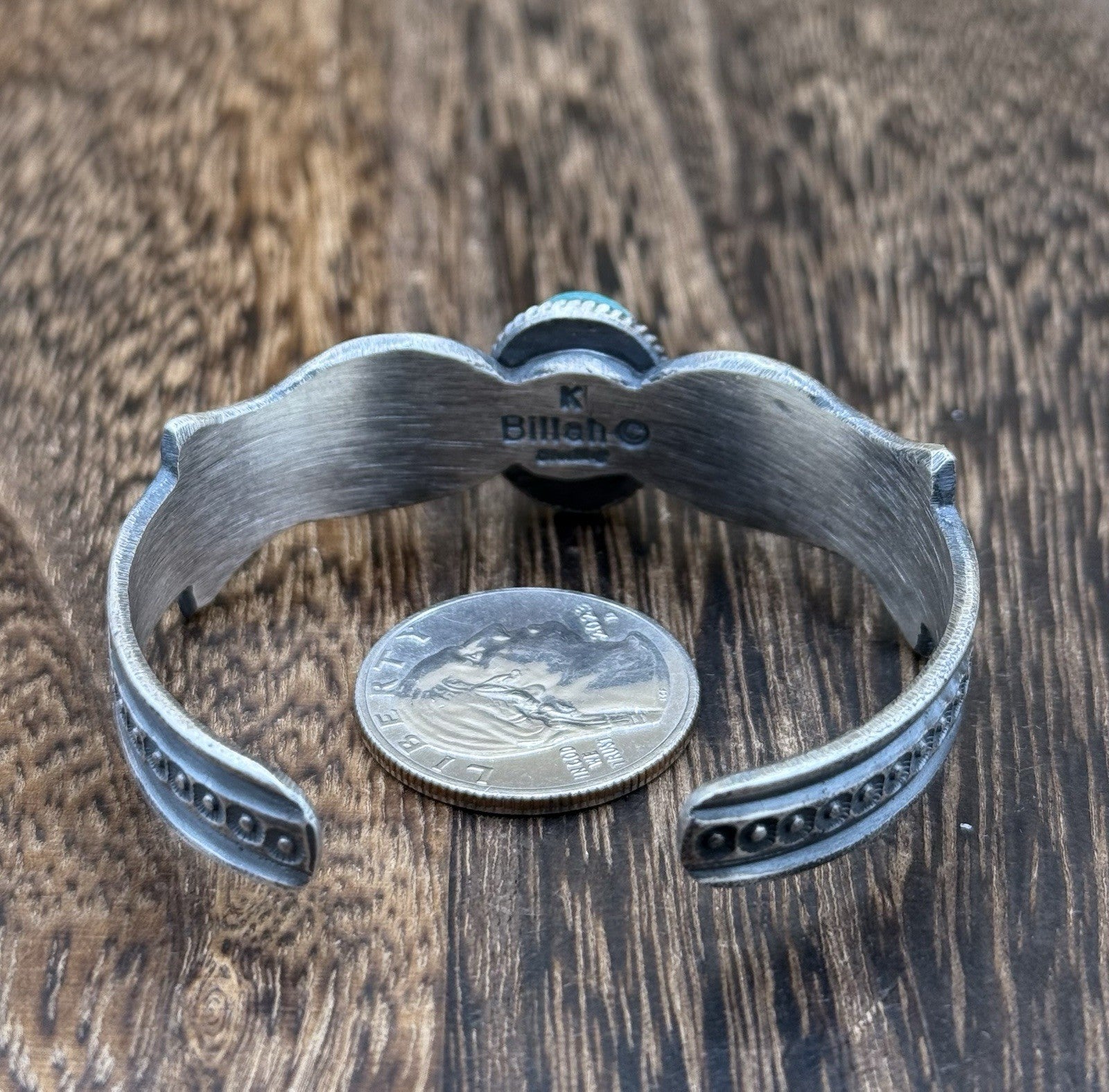 This stunning bracelet is a piece of Native American artistry at its finest. Handmade/casted by Kevin Billah, this sterling silver cuff features a beautiful emerald valley turquoise stone set in bezel. The bracelet has a unique shape and is perfect for any occasion, from Mother's Day to weddings and graduations.