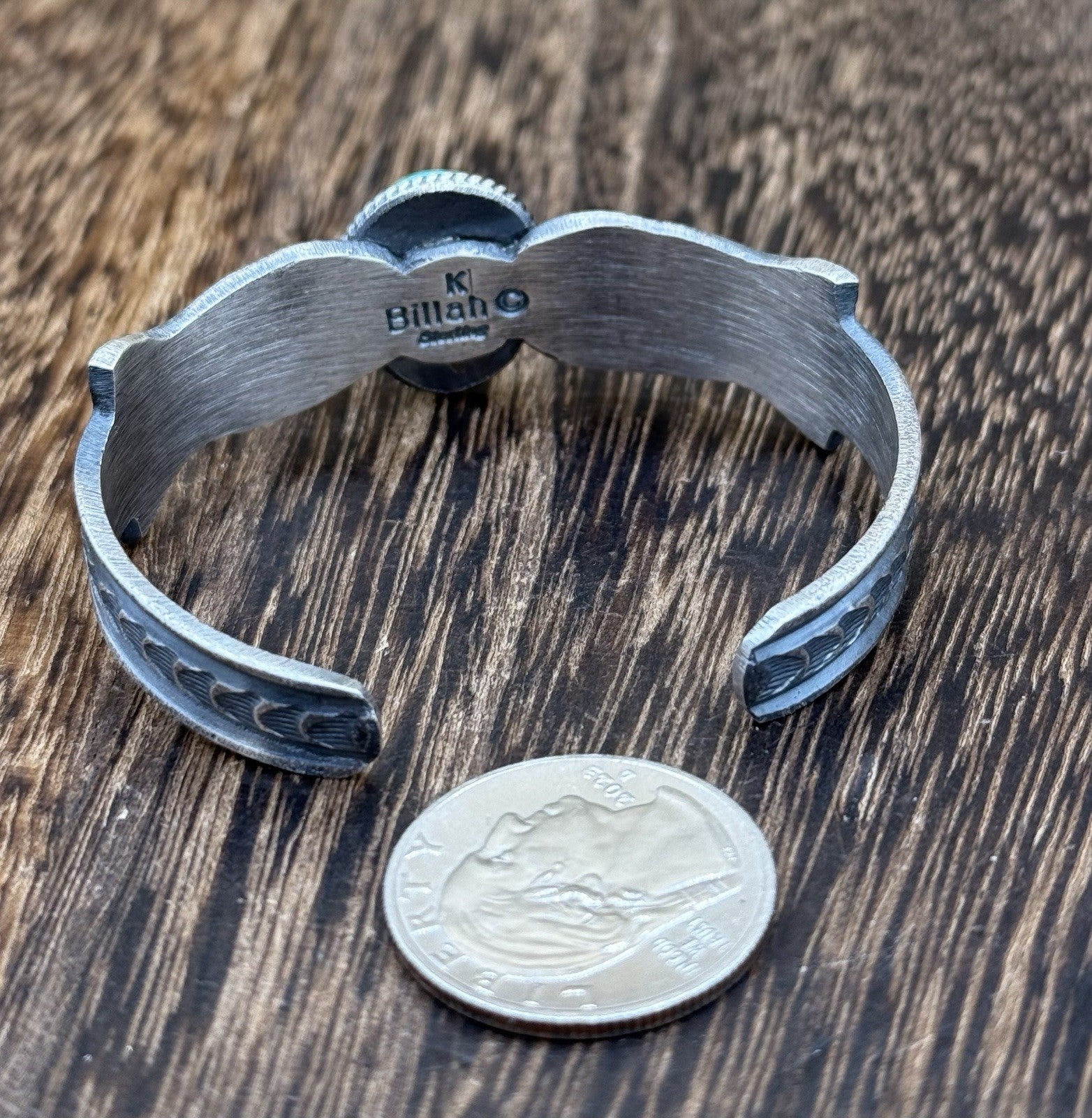 This stunning bracelet is a piece of Native American artistry at its finest. Handmade/casted by Kevin Billah, this sterling silver cuff features a beautiful emerald valley turquoise stone set in bezel. The bracelet has a unique shape and is perfect for any occasion, from Mother's Day to weddings and graduations.