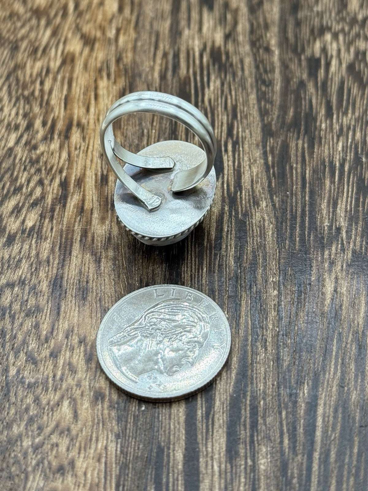 This is a handmade Native american ring made by Tricia Smith. The ring is adorned with golden hills T turquoise. The ring is adjustable from size 7 to size 10