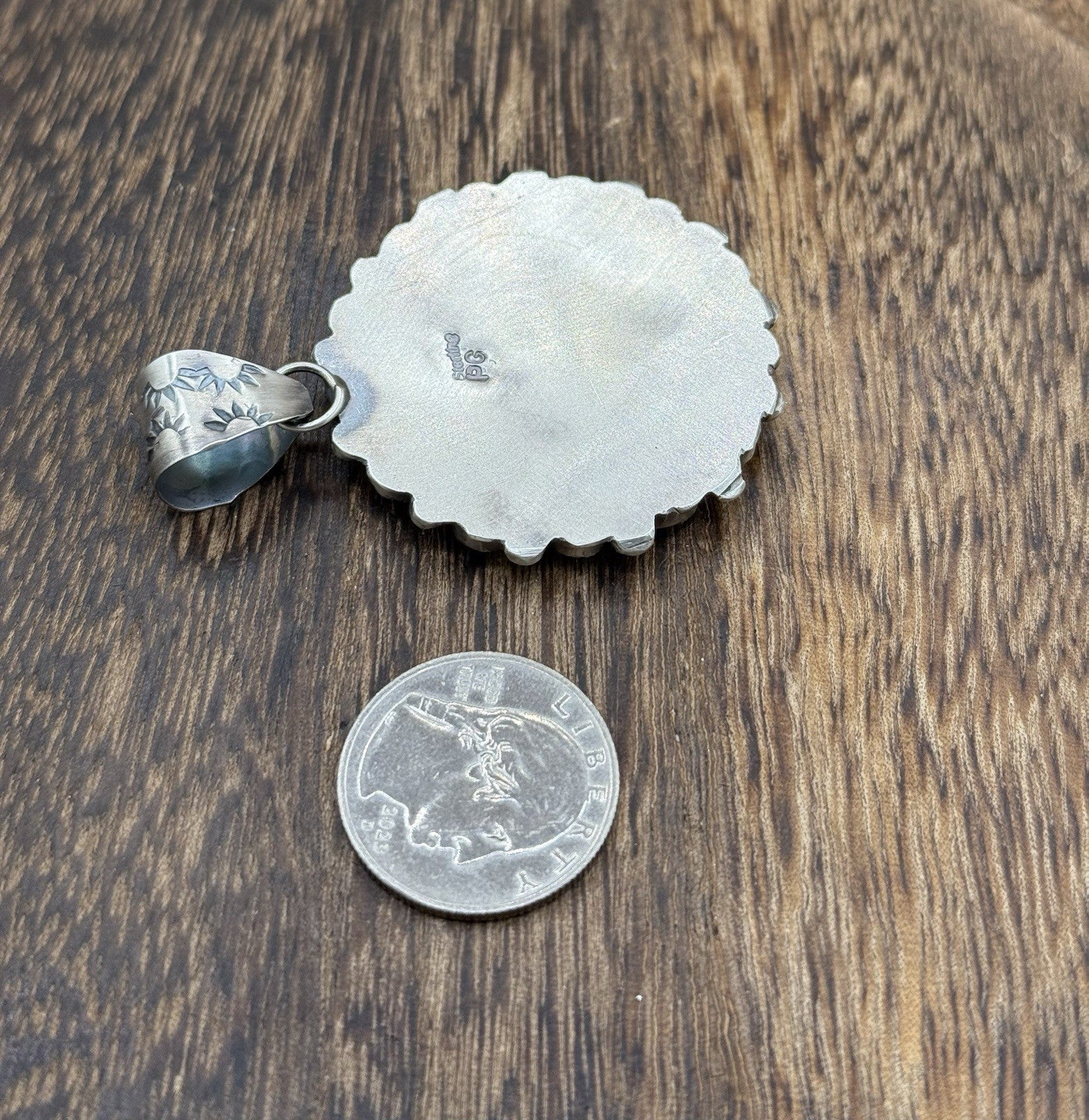 This beautiful pendant is a true work of art. Handmade by Phil Garcia, a Native American artisan. The pendant is made of 925 sterling silver and adorned with stunning golden hills turquoise stones and a coin.
