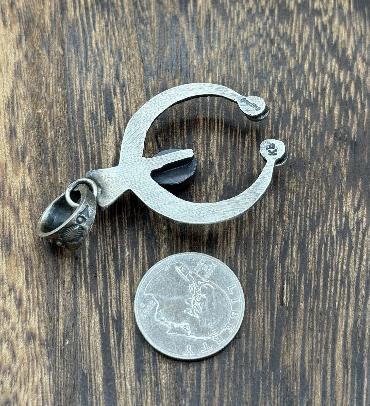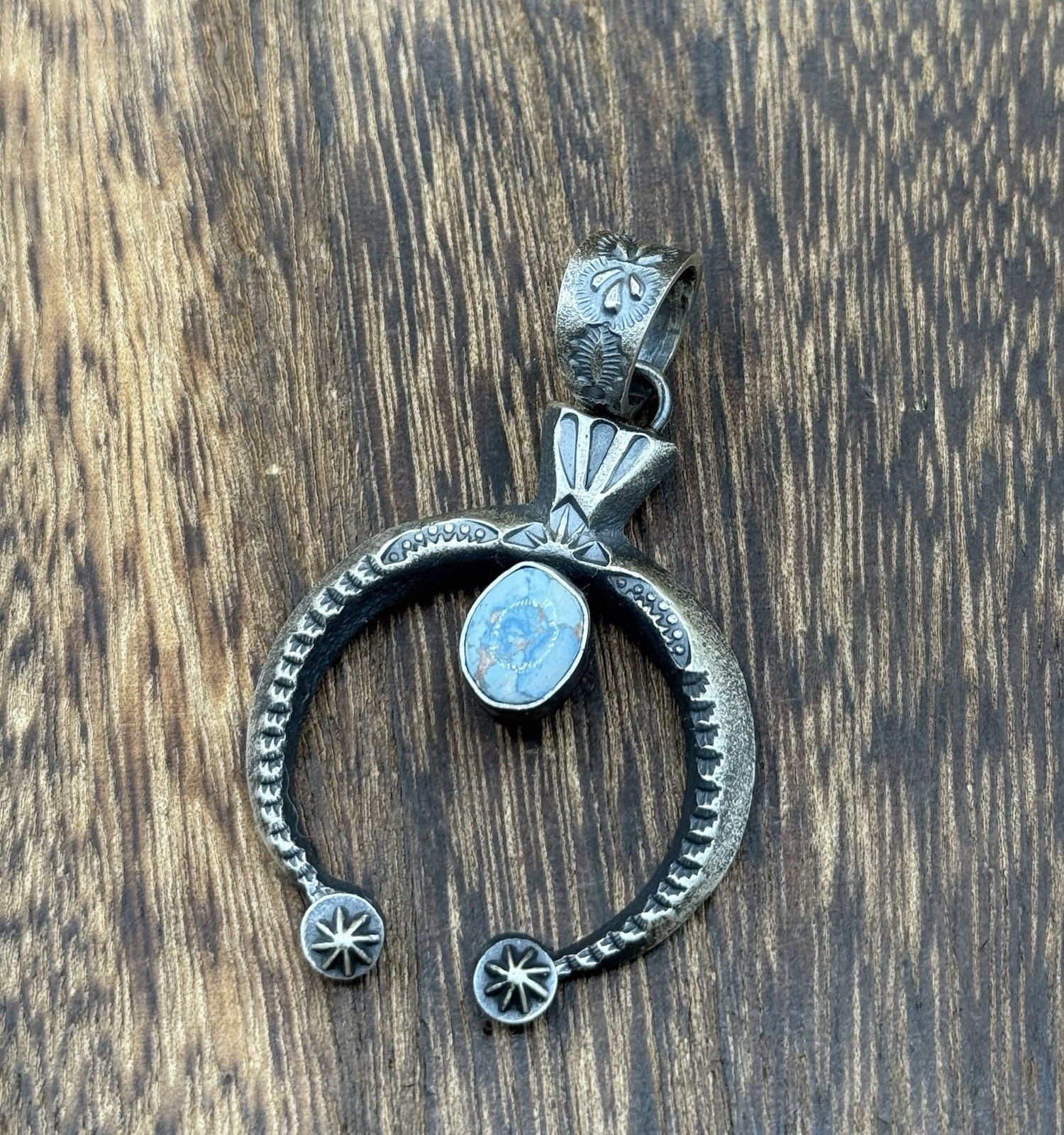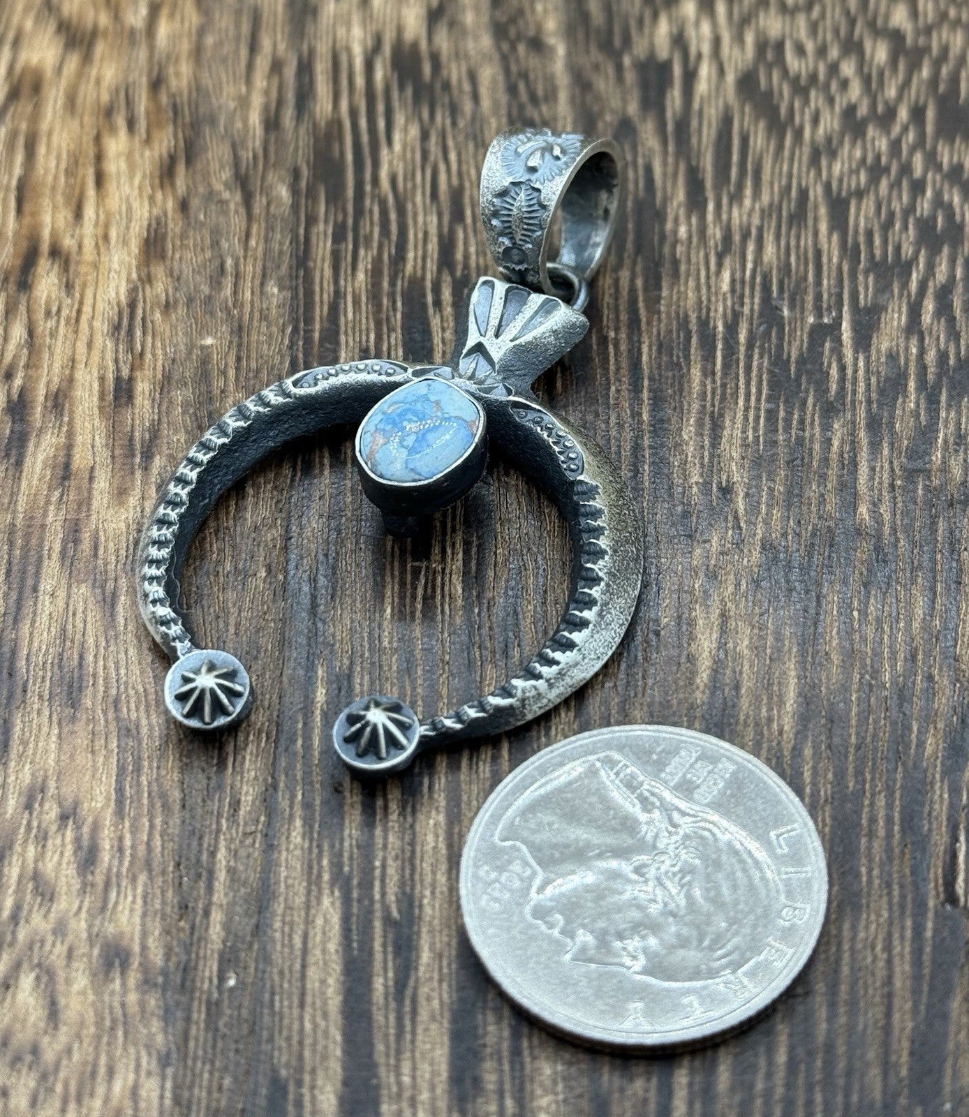 This beautiful pendant is a true work of art. Cast Handmade by Kevin Billah, a Native American artisan, it features a unique dangle shape and a bezel setting style. The pendant is made of 925 sterling silver and adorned with a stunning golden hills turquoise stone.