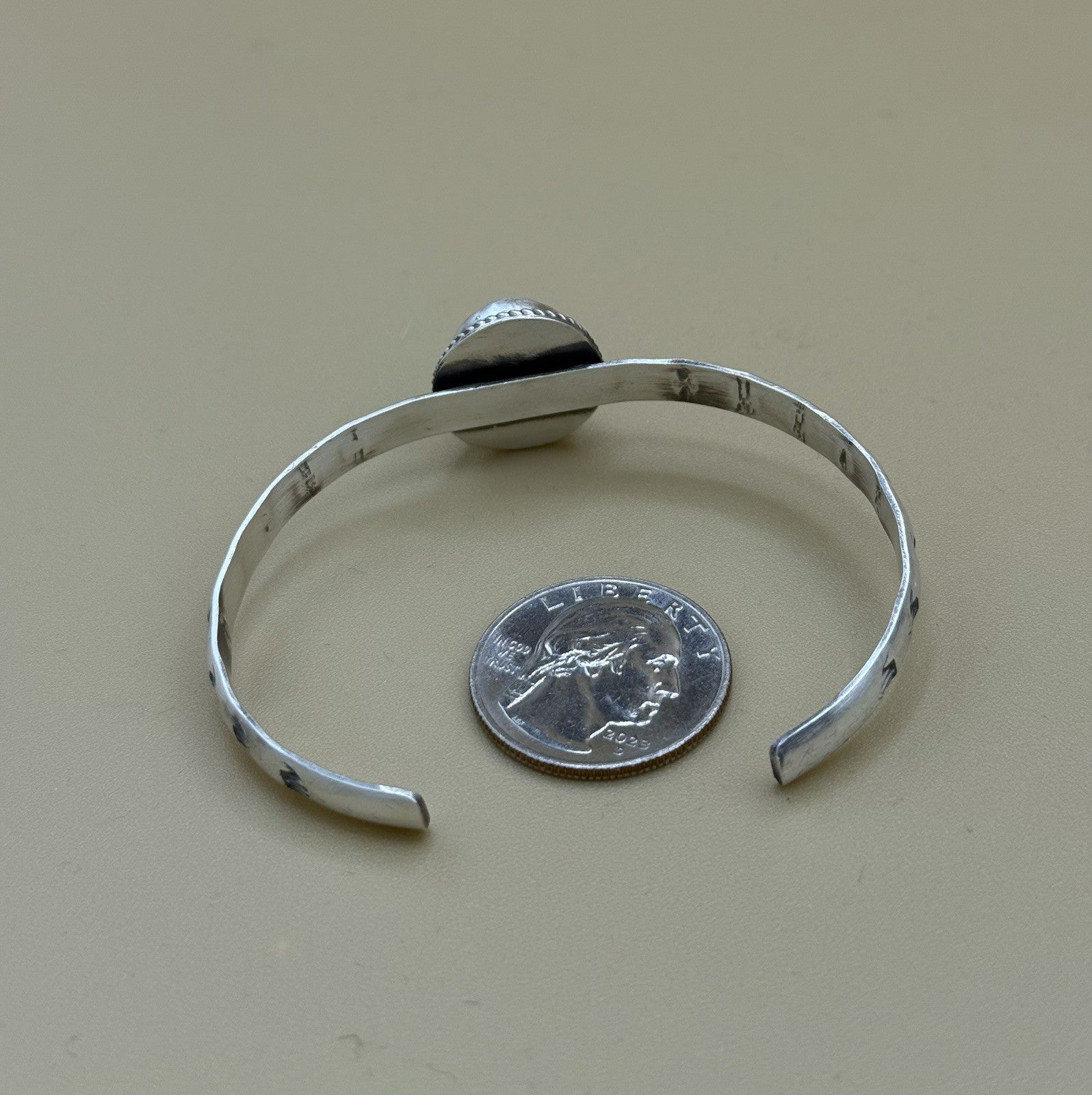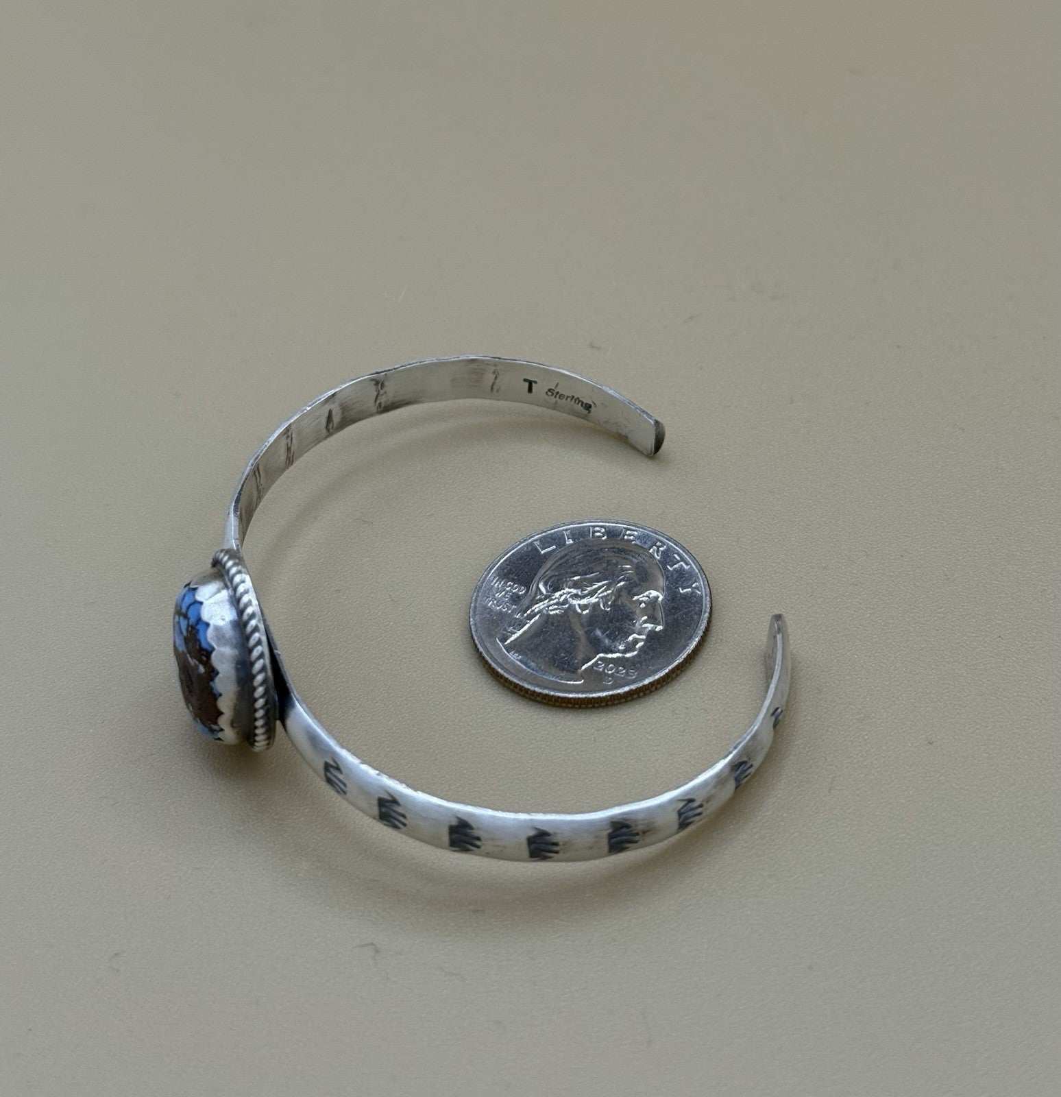 This Native American Navajo handmade cuff bracelet a features beautiful natural golden hills turquoise stone. The intricate design and attention to detail make this bracelet a true beauty. The Navajo tribal affiliation adds to the authenticity and uniqueness of this piece.
