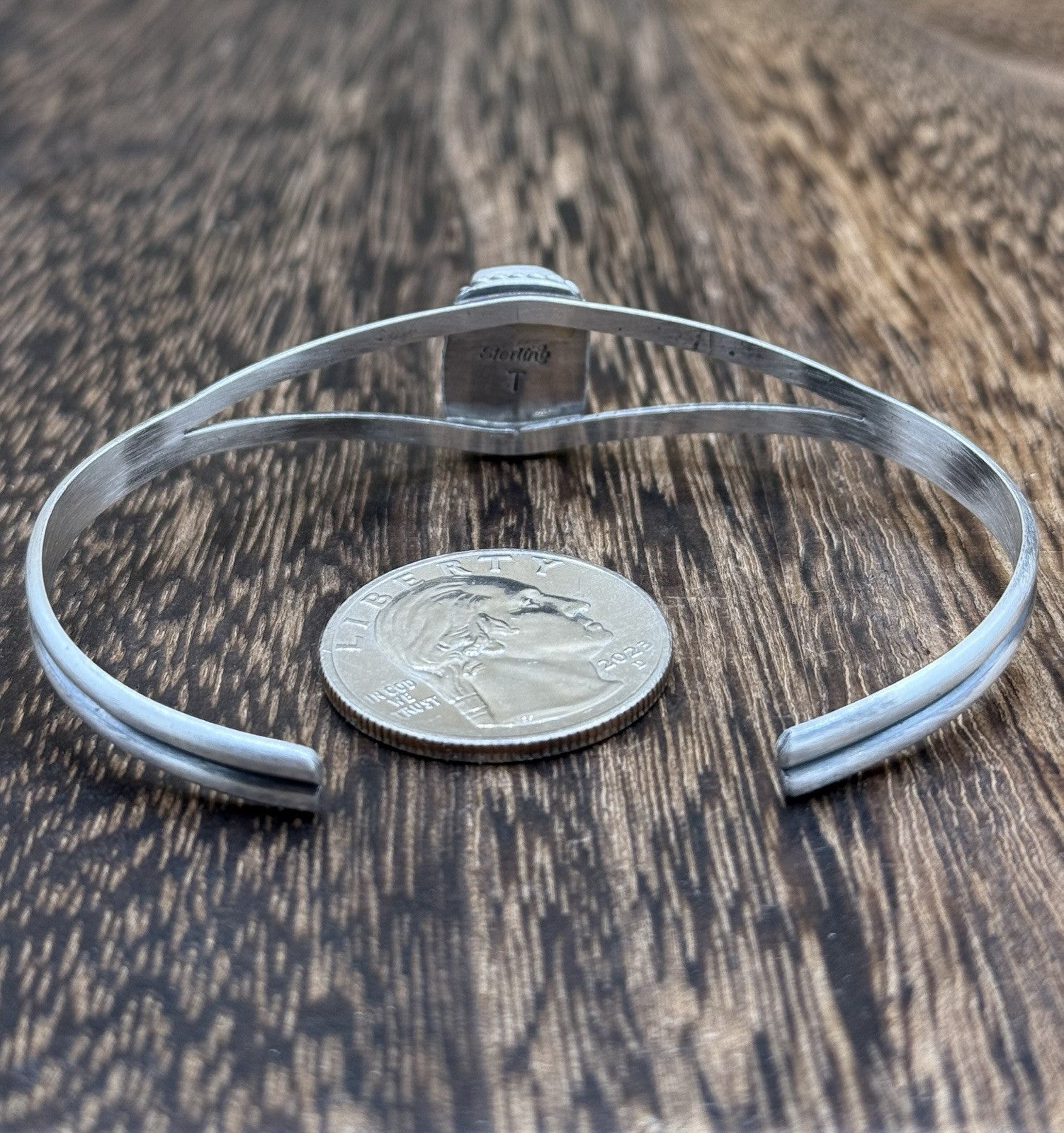 This Native American Navajo handmade cuff bracelet a features beautiful natural golden hills turquoise stone. The intricate design and attention to detail make this bracelet a true beauty. The Navajo tribal affiliation adds to the authenticity and uniqueness of this piece.