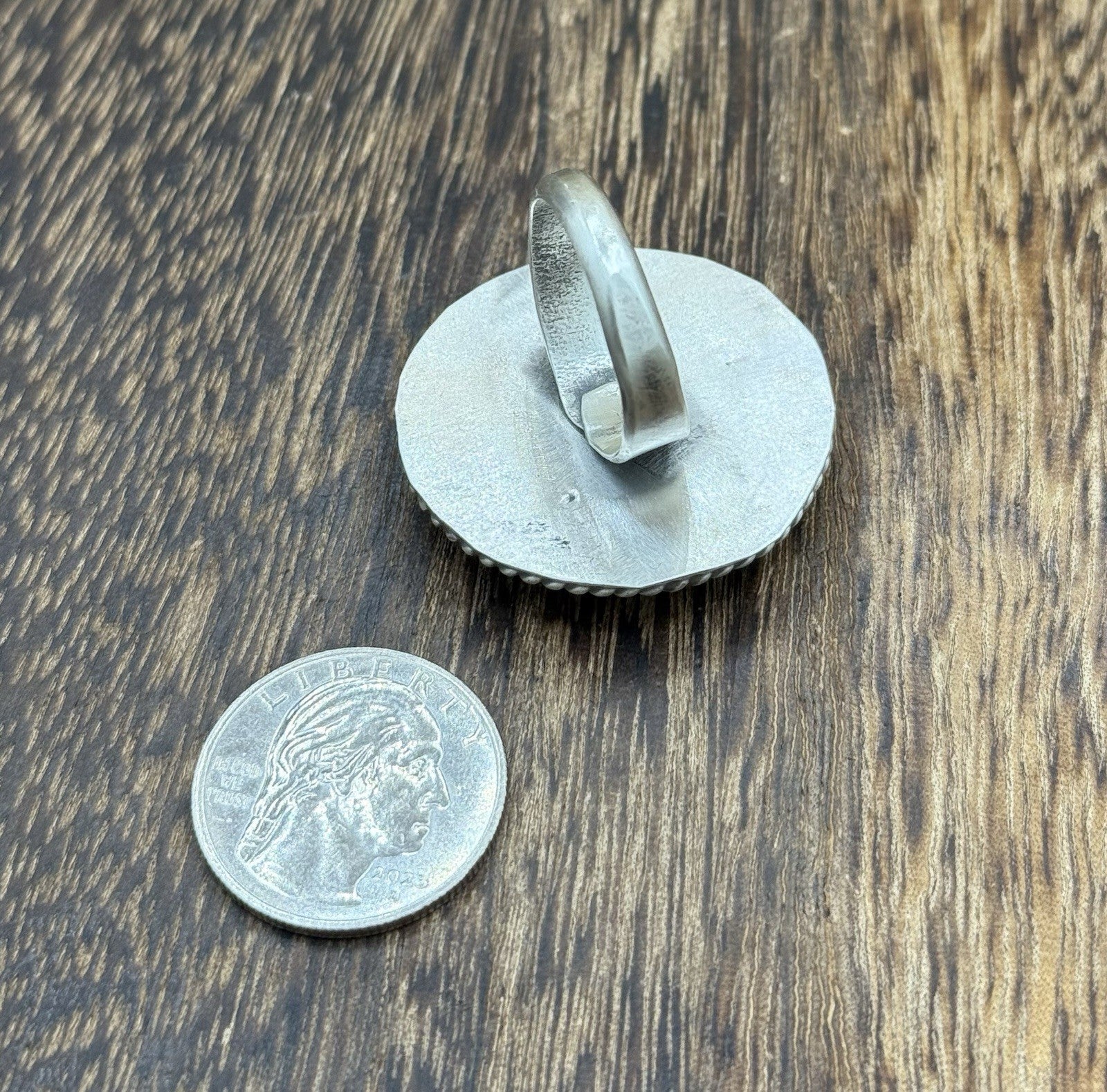 This is a handmade Native american ring made by Merle House Jr. The ring is adorned with kingman turquoise. The ring is adjustable from size 7 to size 9