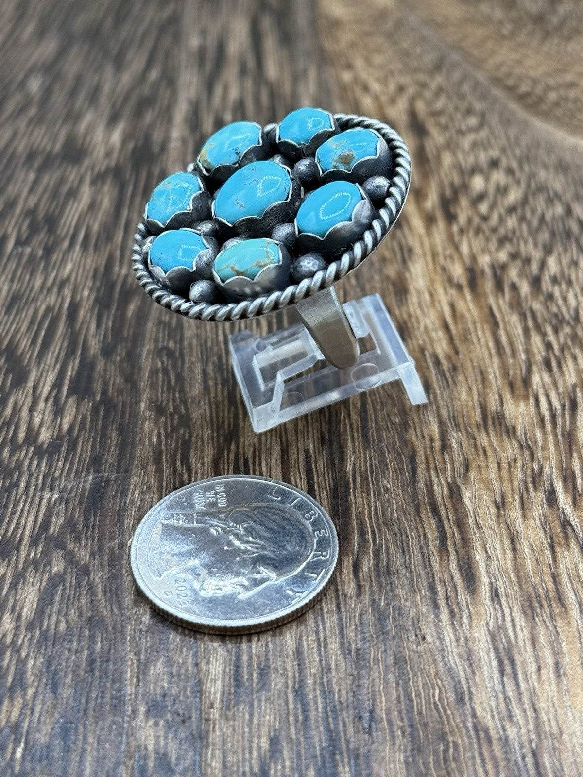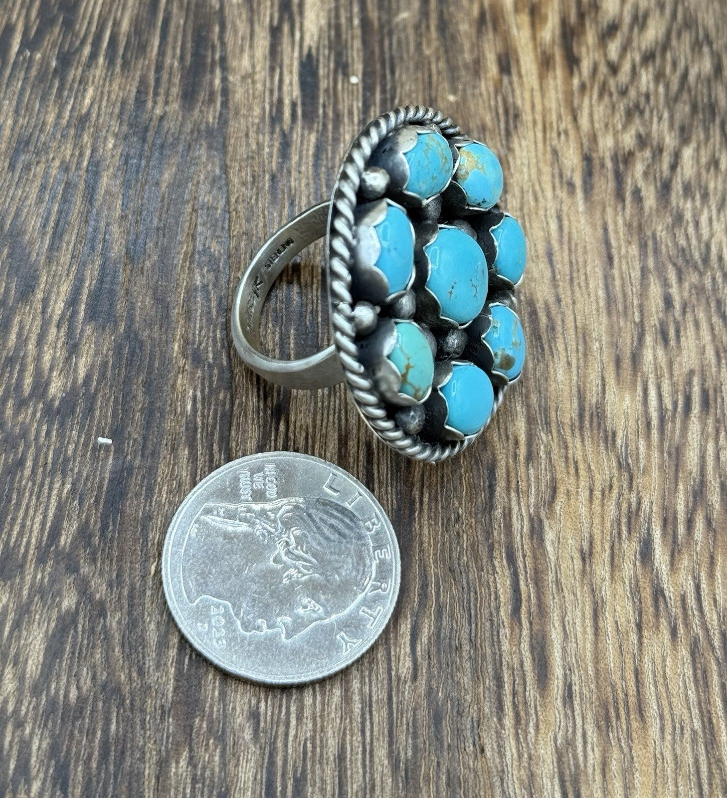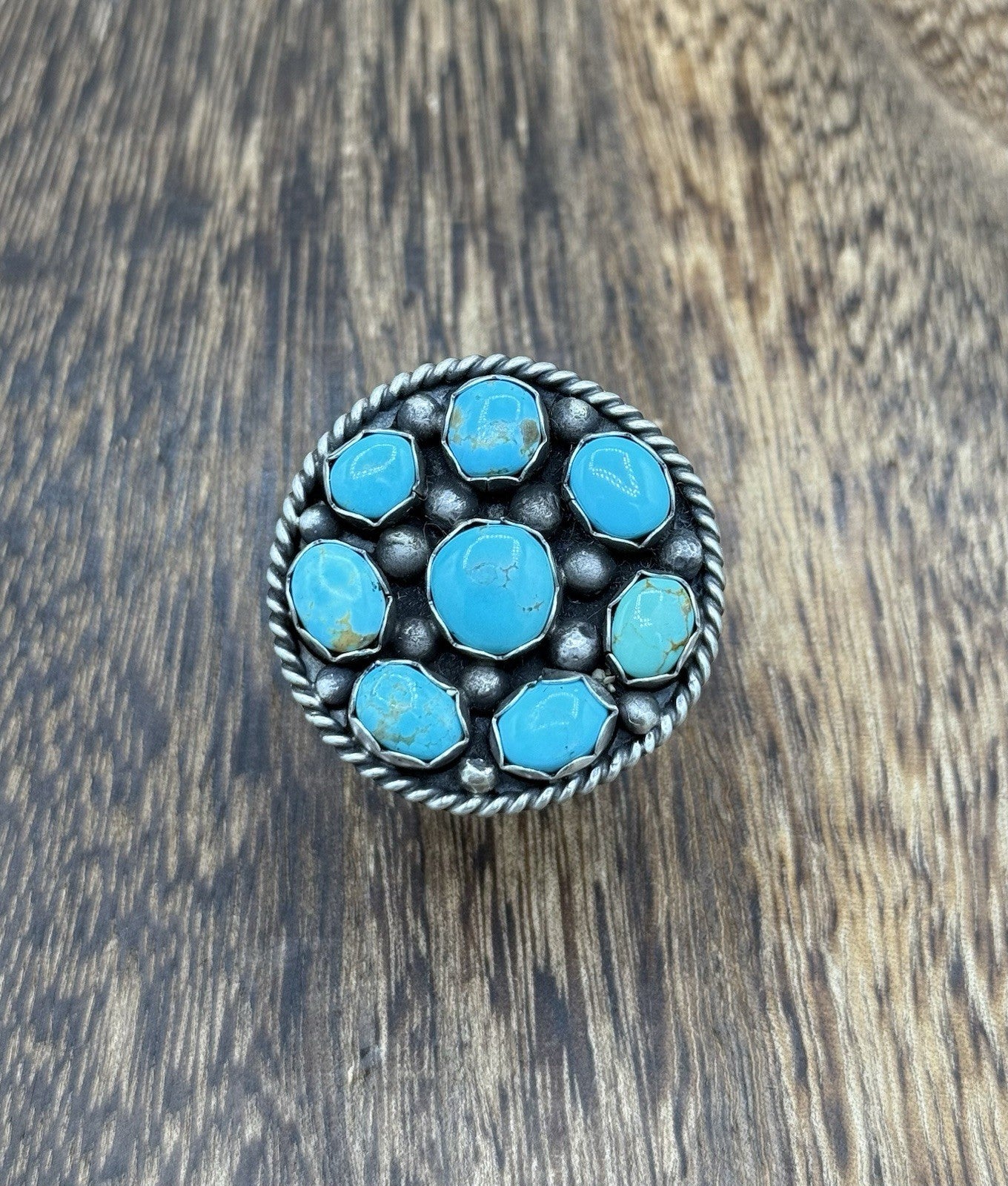 This is a handmade Native american ring made by Merle House Jr. The ring is adorned with kingman turquoise. The ring is adjustable from size 7 to size 9