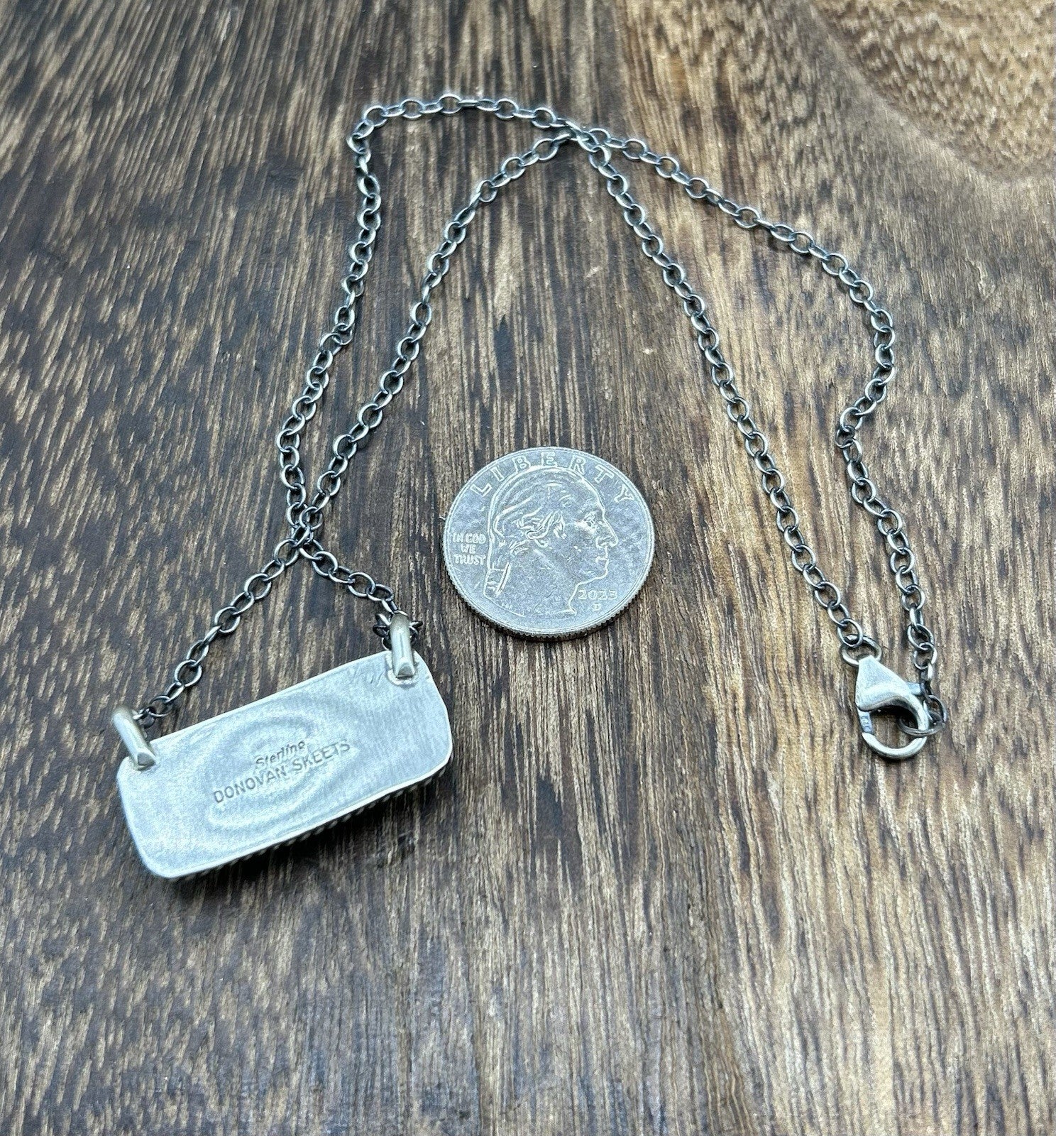 This beautiful handmade necklace is a stunning piece of Native American jewelry. Made by Navajo artisan Donovan Skeets , the necklace features a rectangle kingman turquoise stone set in a sterling silver on a chain. The necklace is signed by the artist.