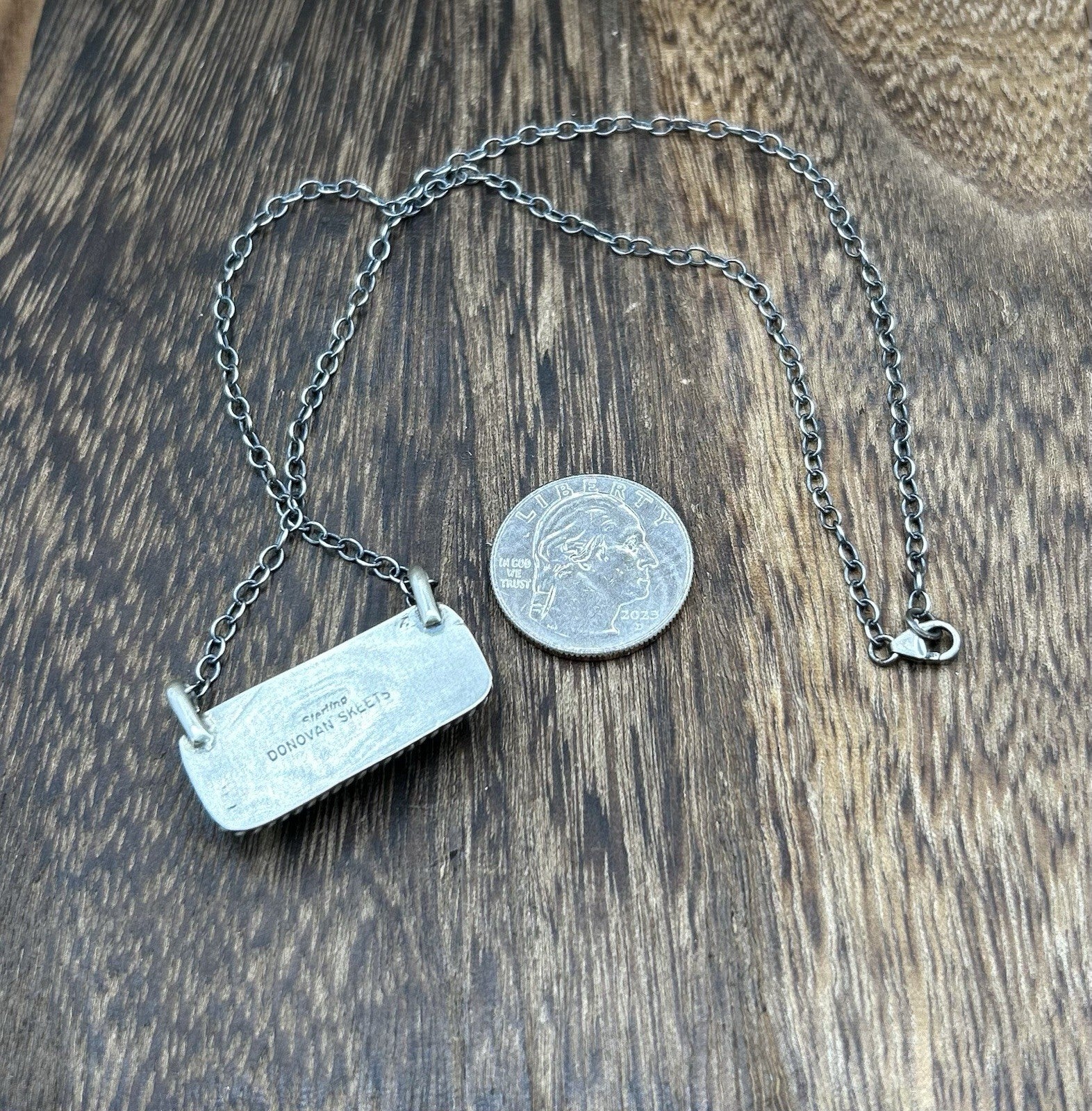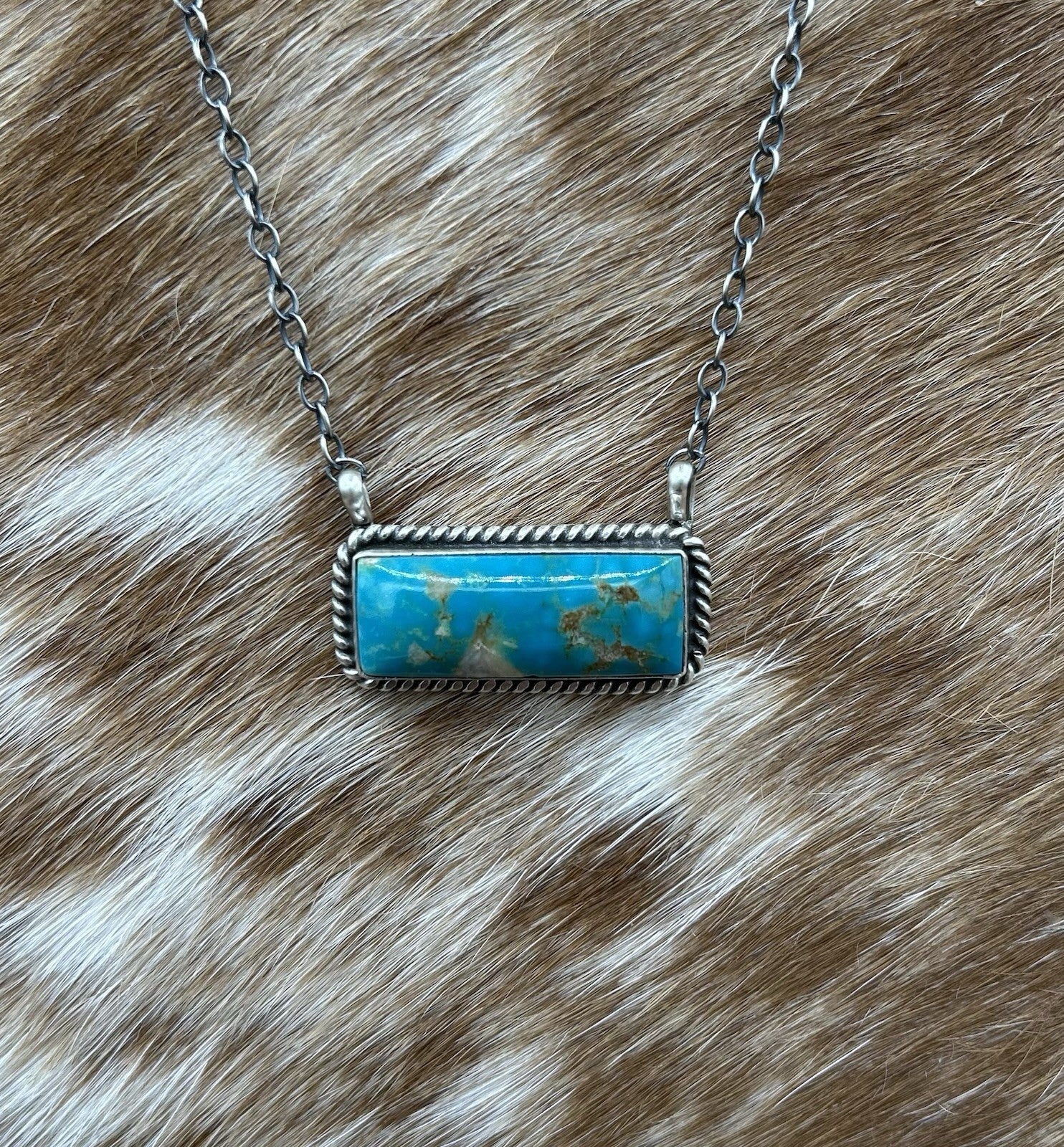 This beautiful handmade necklace is a stunning piece of Native American jewelry. Made by Navajo artisan Donovan Skeets , the necklace features a rectangle kingman turquoise stone set in a sterling silver on a chain. The necklace is signed by the artist.