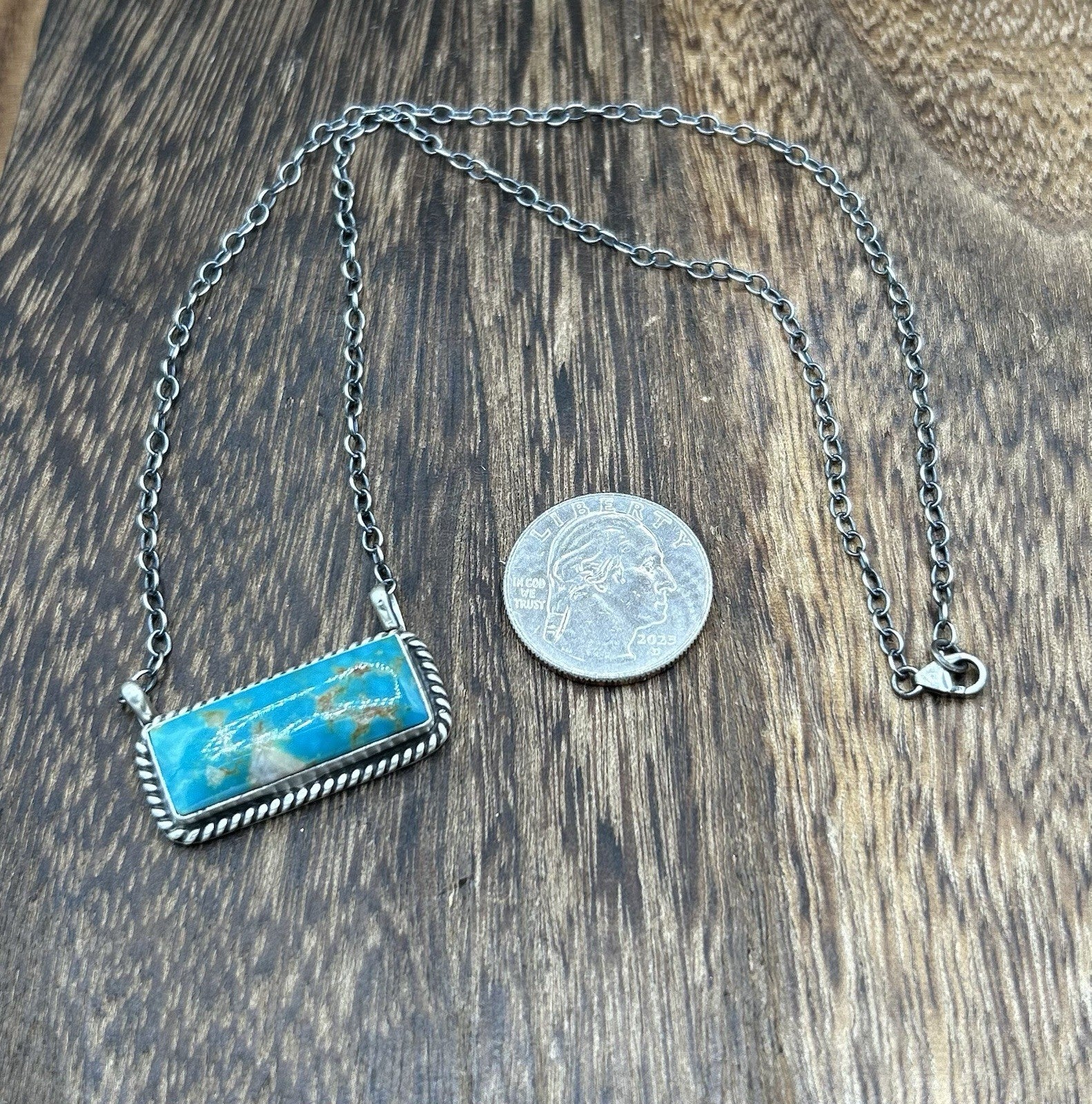 Navajo Handmade Sterling Silver Kingman Turquoise Bar Necklace 16”