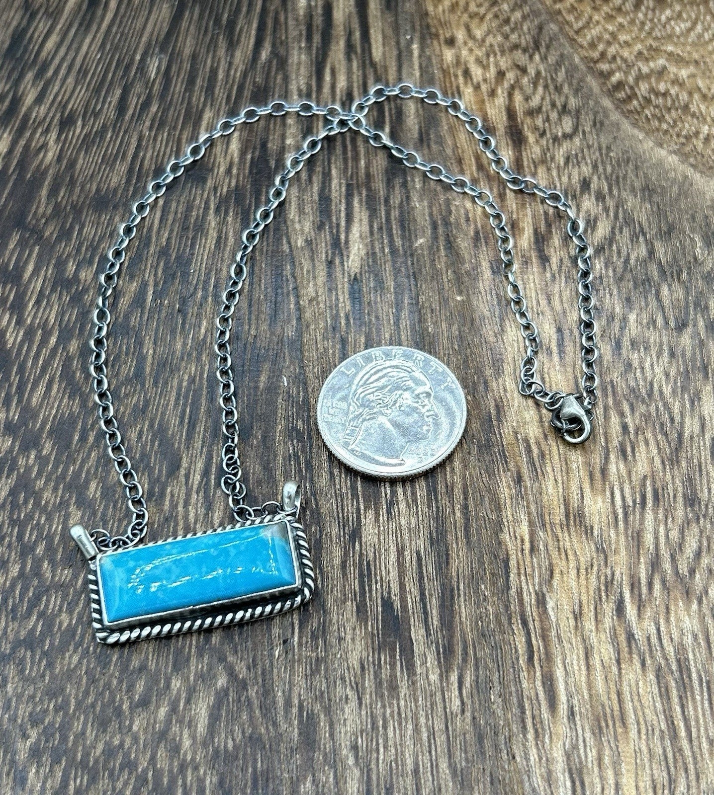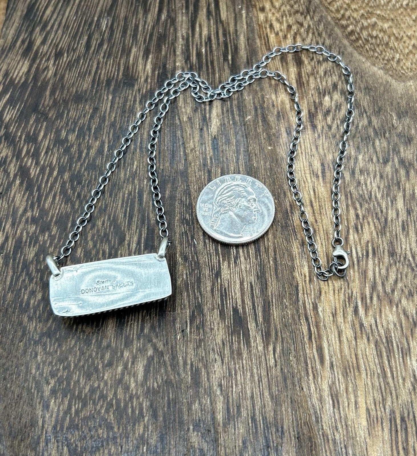 This beautiful handmade necklace is a stunning piece of Native American jewelry. Made by Navajo artisan Donovan Skeets , the necklace features a rectangle kingman turquoise stone set in a sterling silver on a chain. The necklace is signed by the artist.
