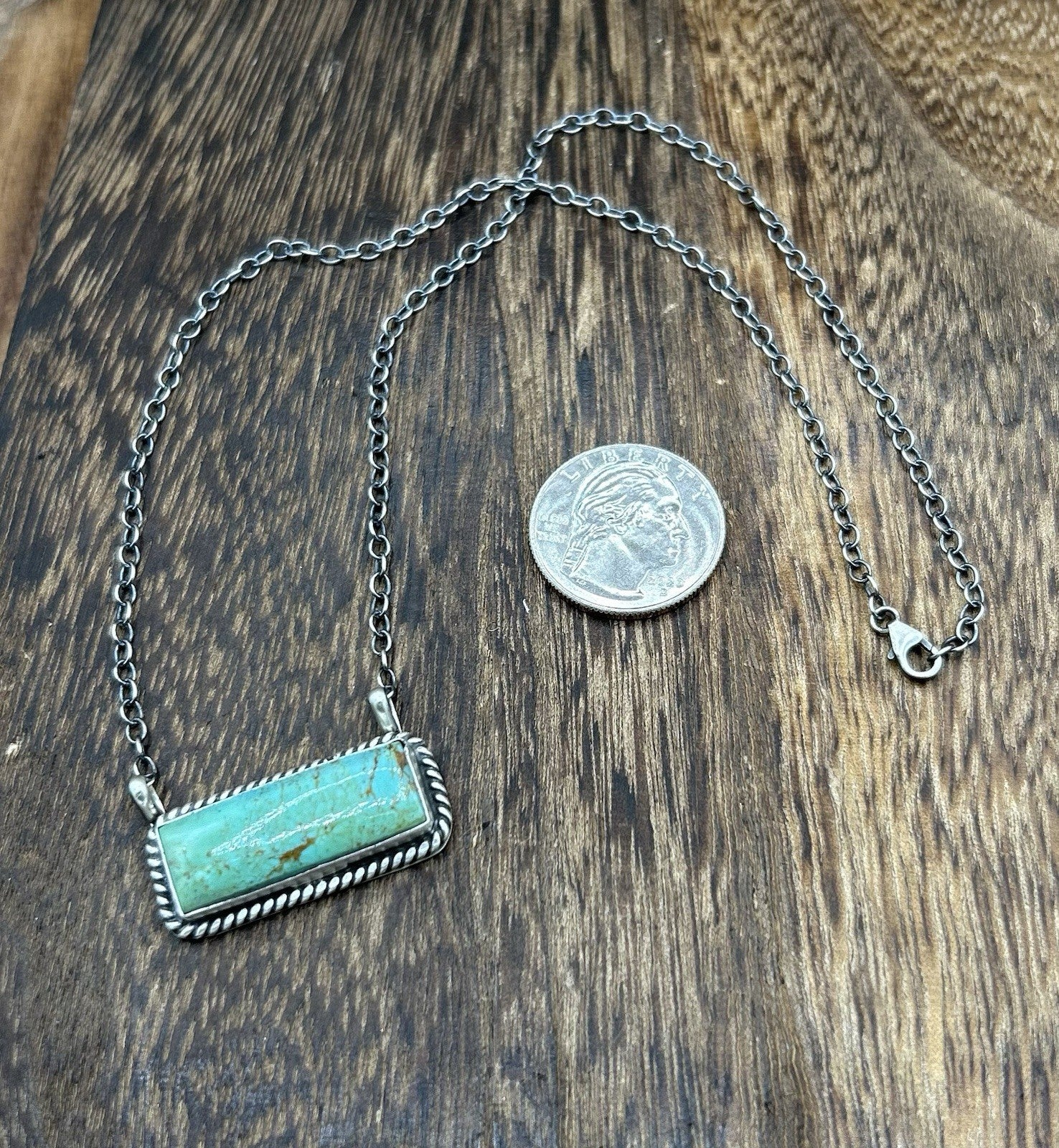 This beautiful handmade necklace is a stunning piece of Native American jewelry. Made by Navajo artisan Donovan Skeets , the necklace features a rectangle kingman turquoise stone set in a sterling silver on a chain. The necklace is signed by the artist.