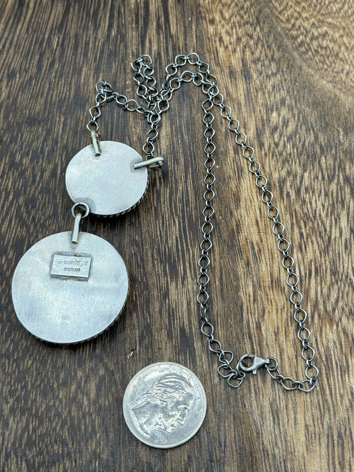 This exquisite cluster necklace is a true work of art handcrafted by Native American artisan Merle House Jr., The stunning cluster shaped necklace features beautiful Kingman Turquoise stones set in sterling silver bezel. The pendant hangs on an 18-inch chain with lobster closure, making it a perfect accessory for any occasion.