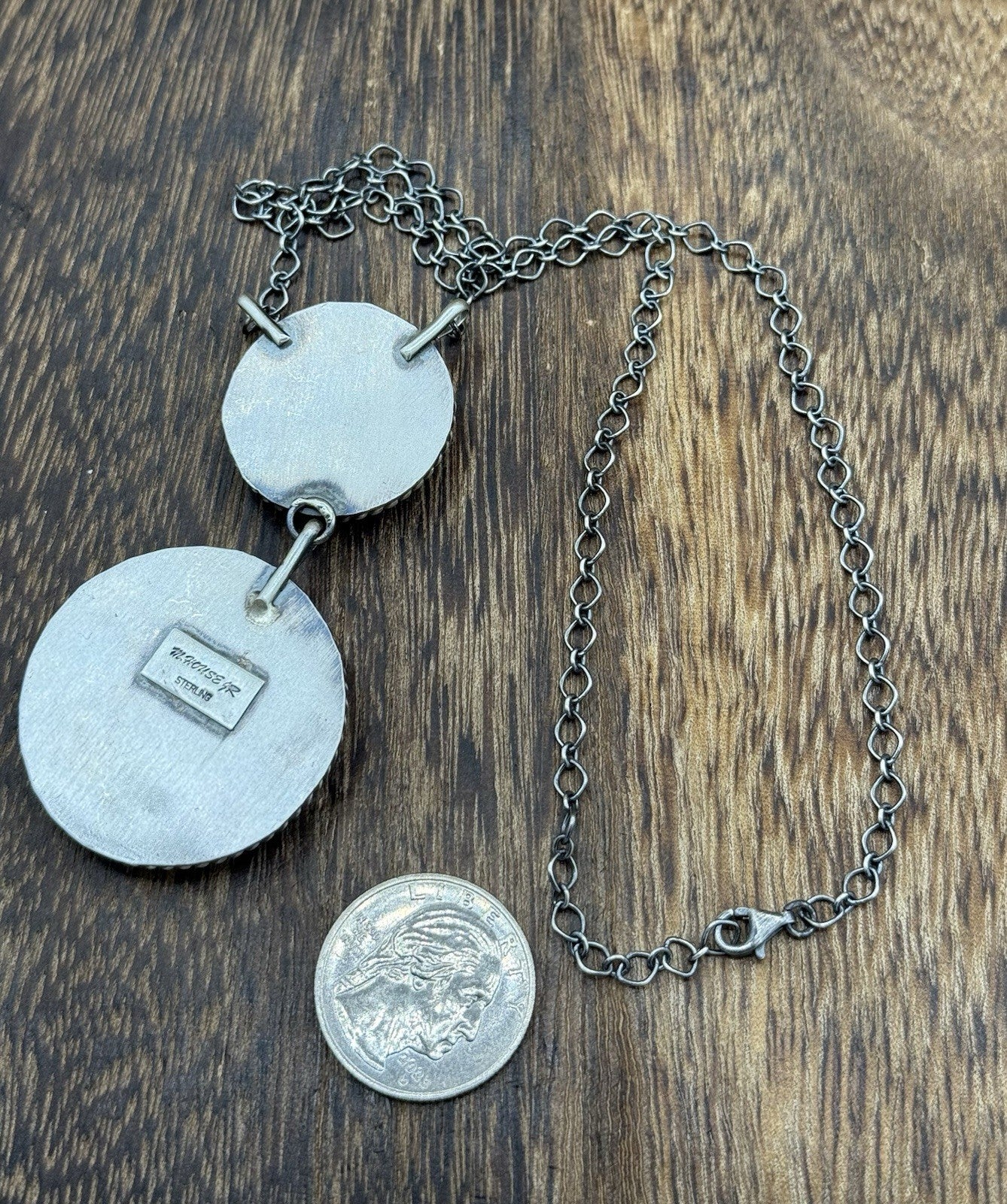 This exquisite cluster necklace is a true work of art handcrafted by Native American artisan Merle House Jr., The stunning cluster shaped necklace features beautiful Kingman Turquoise stones set in sterling silver bezel. The pendant hangs on an 18-inch chain with lobster closure, making it a perfect accessory for any occasion.
