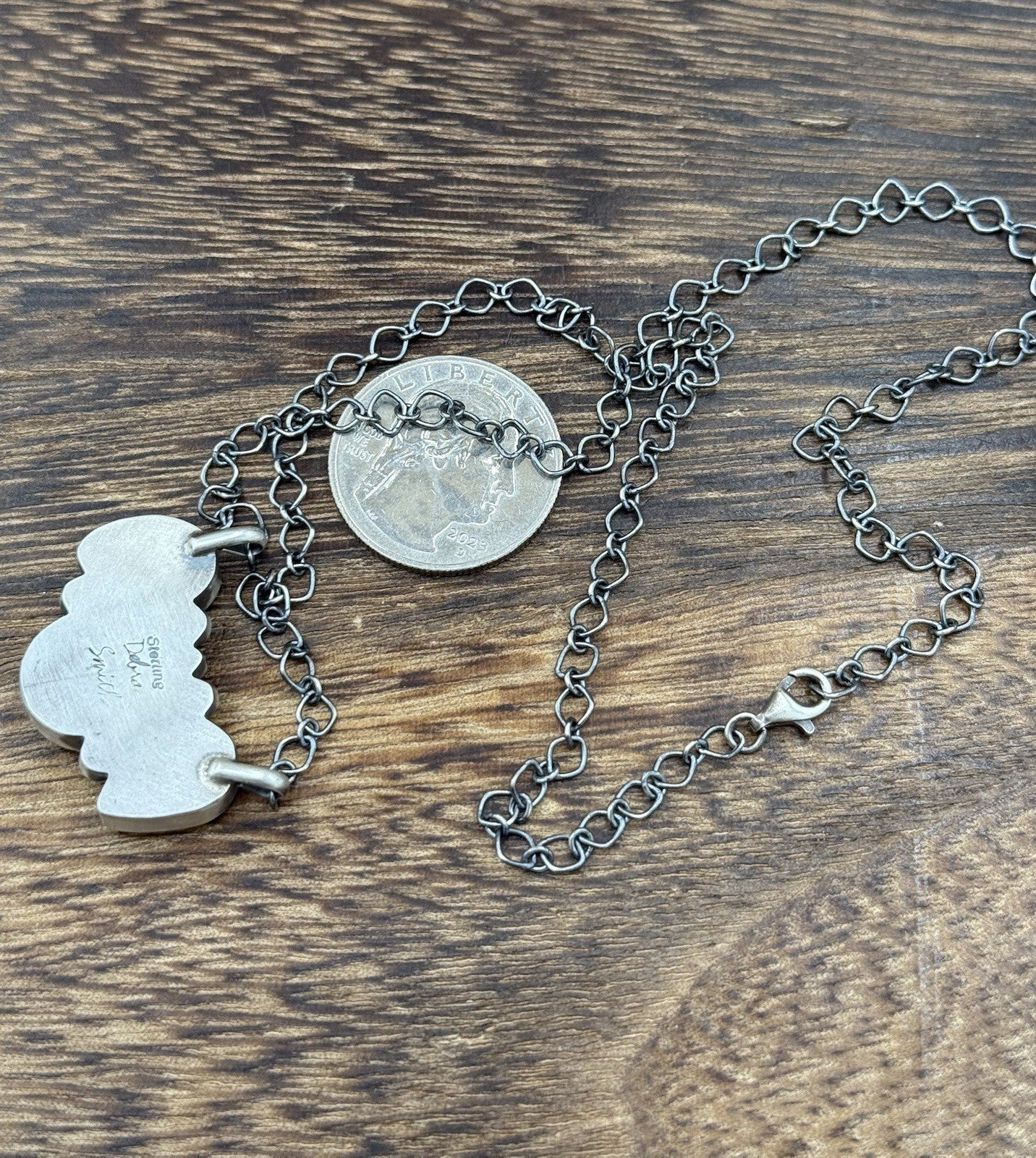 This exquisite necklace is a true work of art handcrafted by Native American Debra Smtih, The stunning cluster bar shaped necklace features beautiful Kingman Turquoise stones set in sterling silver bezel. The pendant hangs on an 18-inch chain with lobster closure, making it a perfect accessory for any occasion.