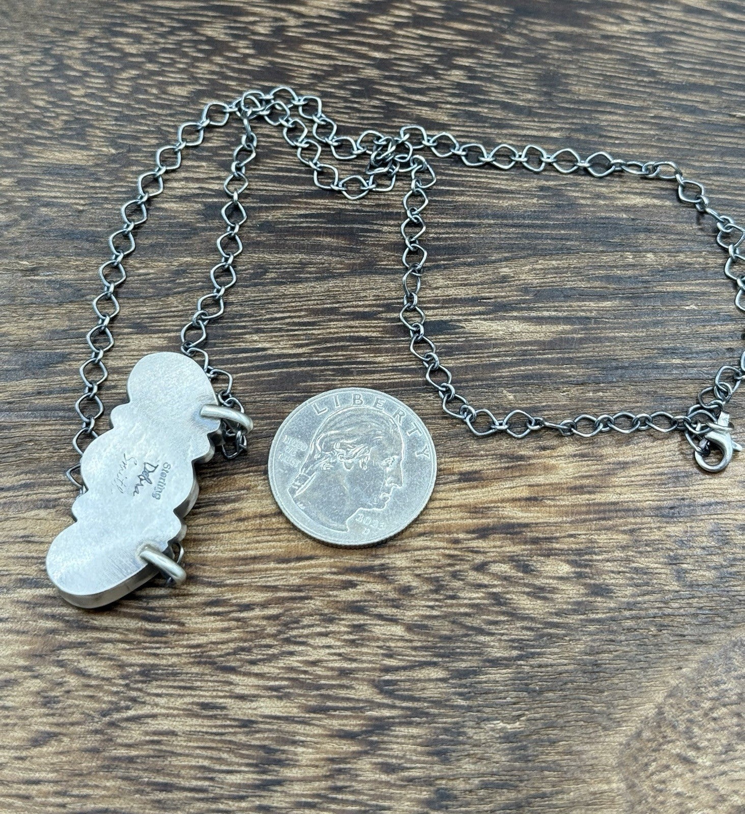 This exquisite necklace is a true work of art handcrafted by Native American Debra Smtih, The stunning cluster bar shaped necklace features beautiful Kingman Turquoise stones set in sterling silver bezel. The pendant hangs on an 18-inch chain with lobster closure, making it a perfect accessory for any occasion.