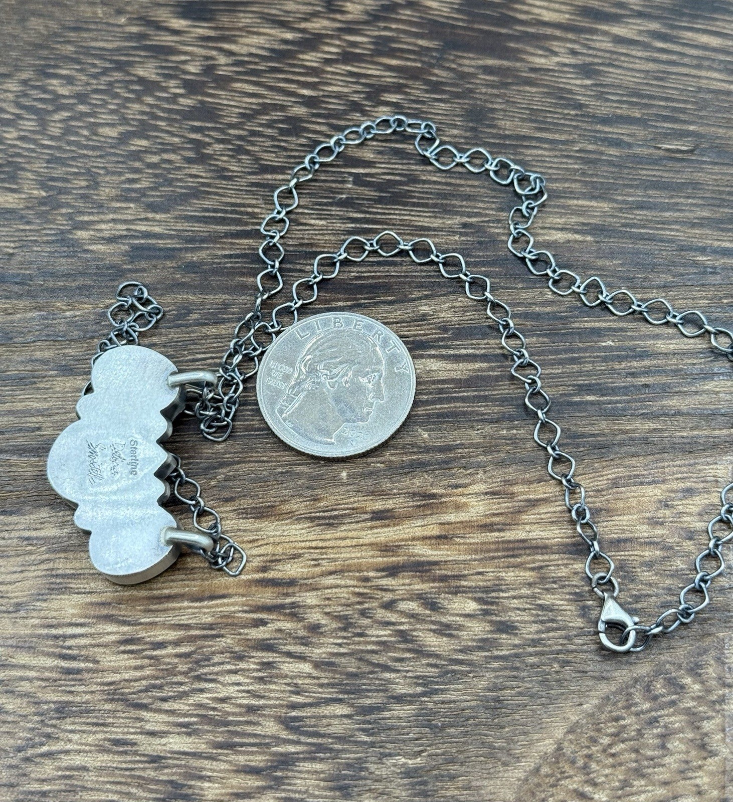 This exquisite necklace is a true work of art handcrafted by Native American Debra Smtih, The stunning cluster bar shaped necklace features beautiful Kingman Turquoise stones set in sterling silver bezel. The pendant hangs on an 18-inch chain with lobster closure, making it a perfect accessory for any occasion.