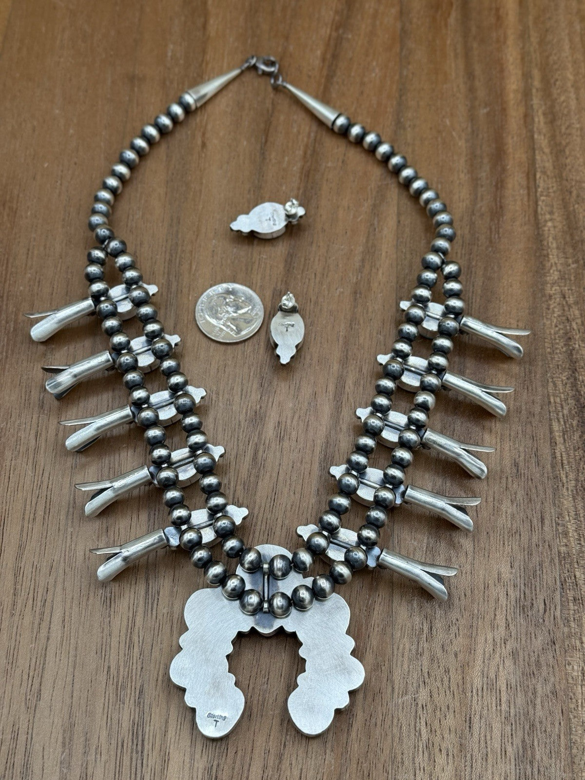 Navajo Handmade Sterling Silver Kingman Turquoise Squash Blossom Necklace 20”