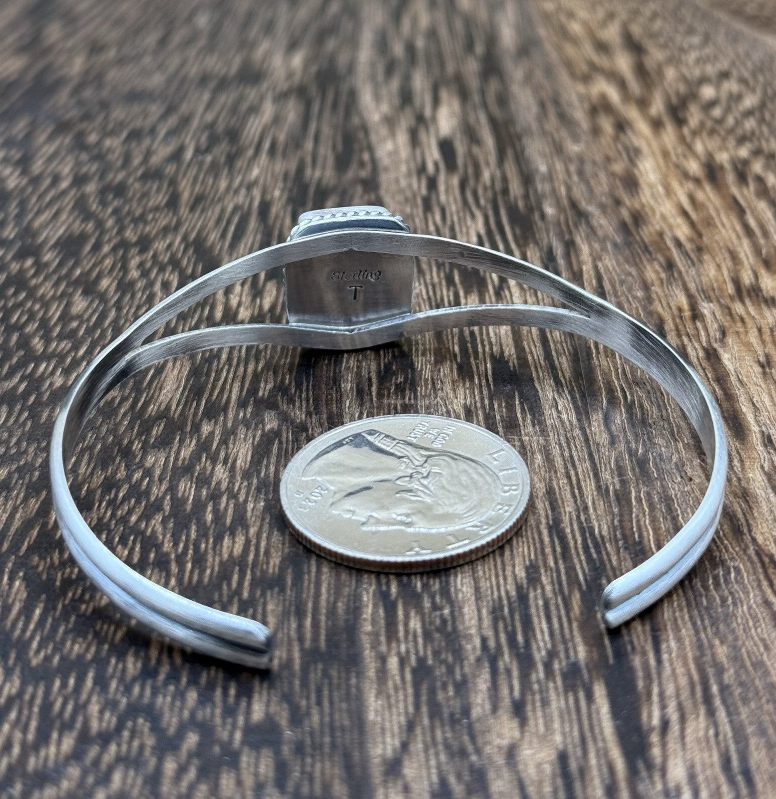 This Native American Navajo handmade cuff bracelet a features beautiful natural kingman turquoise stone. The intricate design and attention to detail make this bracelet a true beauty. The Navajo tribal affiliation adds to the authenticity and uniqueness of this piece.