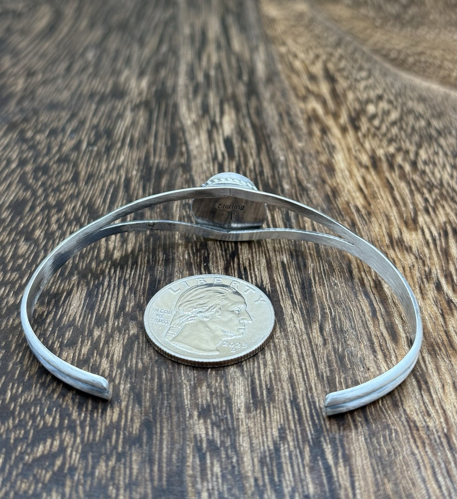 This Native American Navajo handmade cuff bracelet a features beautiful natural kingman turquoise stone. The intricate design and attention to detail make this bracelet a true beauty. The Navajo tribal affiliation adds to the authenticity and uniqueness of this piece.
