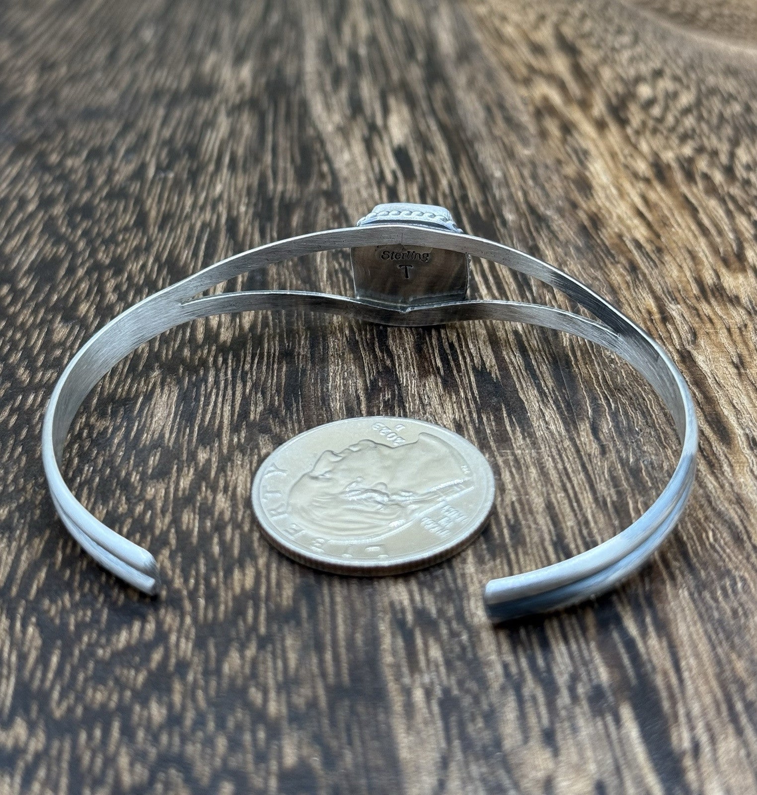 This Native American Navajo handmade cuff bracelet a features beautiful natural kingman turquoise stone. The intricate design and attention to detail make this bracelet a true beauty. The Navajo tribal affiliation adds to the authenticity and uniqueness of this piece.