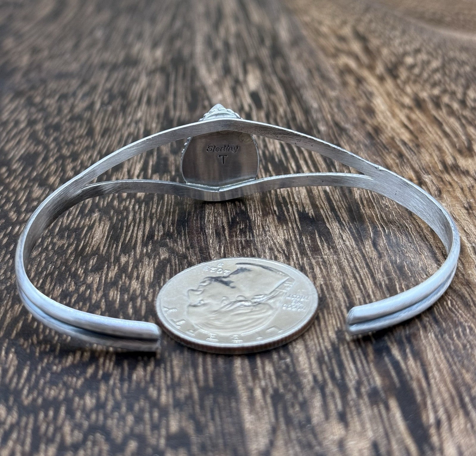 This Native American Navajo handmade cuff bracelet a features beautiful natural kingman turquoise stone. The intricate design and attention to detail make this bracelet a true beauty. The Navajo tribal affiliation adds to the authenticity and uniqueness of this piece.