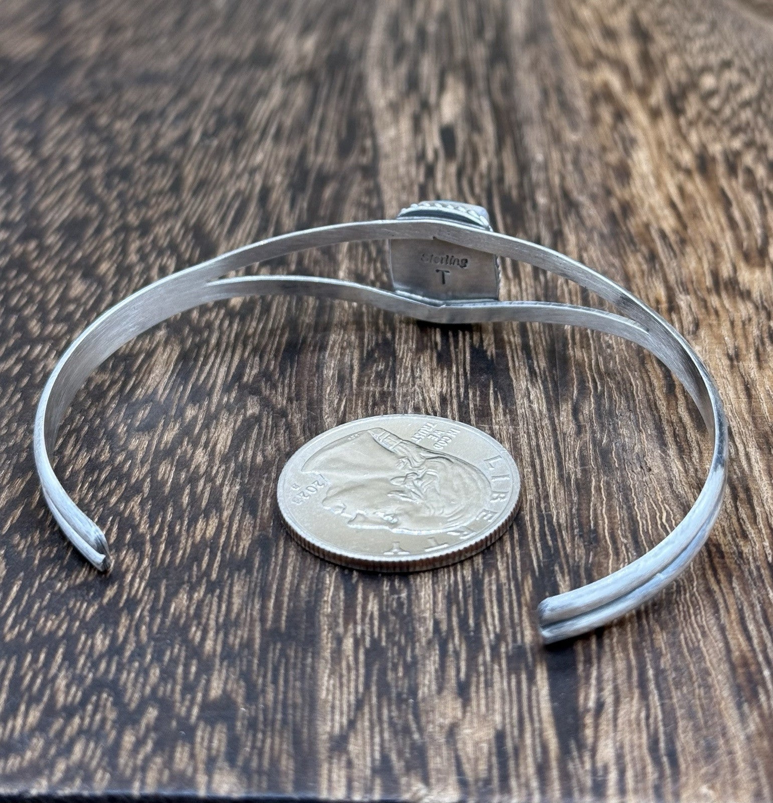 This Native American Navajo handmade cuff bracelet a features beautiful natural kingman turquoise stone. The intricate design and attention to detail make this bracelet a true beauty. The Navajo tribal affiliation adds to the authenticity and uniqueness of this piece.