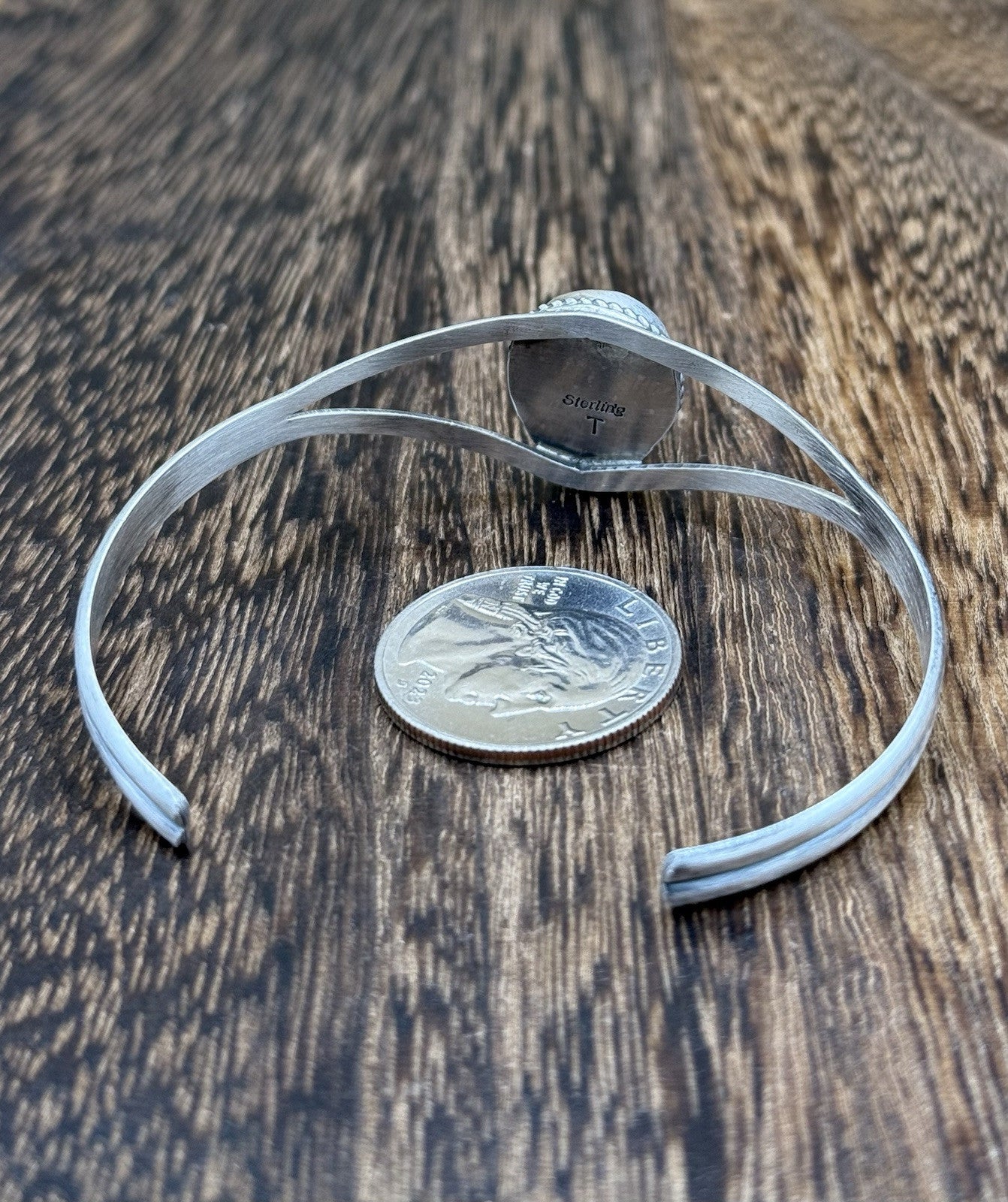 This Native American Navajo handmade cuff bracelet a features beautiful natural kingman turquoise stone. The intricate design and attention to detail make this bracelet a true beauty. The Navajo tribal affiliation adds to the authenticity and uniqueness of this piece.