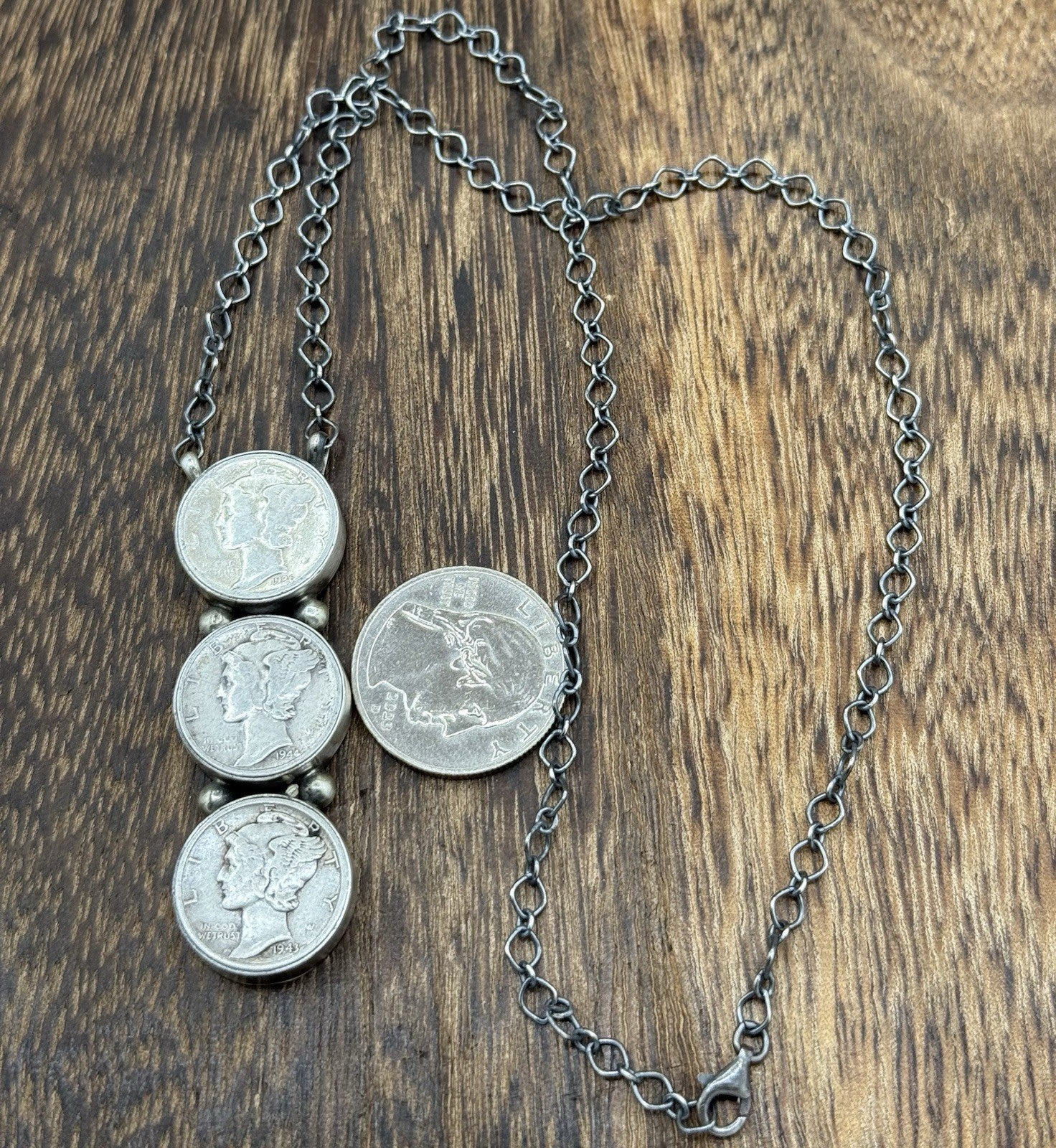 This exquisite cluster necklace is a true work of art handcrafted by Native American artisan Debra Smith, The stunning cluster shaped necklace features beautiful silver liberty dimes set in sterling silver bezel. The pendant hangs on an 18-inch chain with lobster closure, making it a perfect accessory for any occasion.