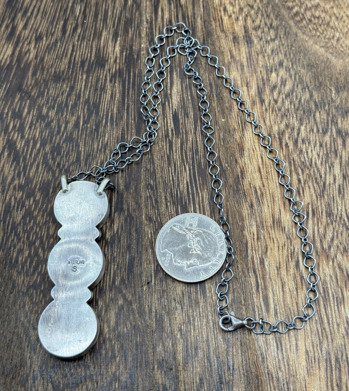 This exquisite cluster necklace is a true work of art handcrafted by Native American artisan Debra Smith, The stunning cluster shaped necklace features beautiful silver liberty dimes set in sterling silver bezel. The pendant hangs on an 18-inch chain with lobster closure, making it a perfect accessory for any occasion.