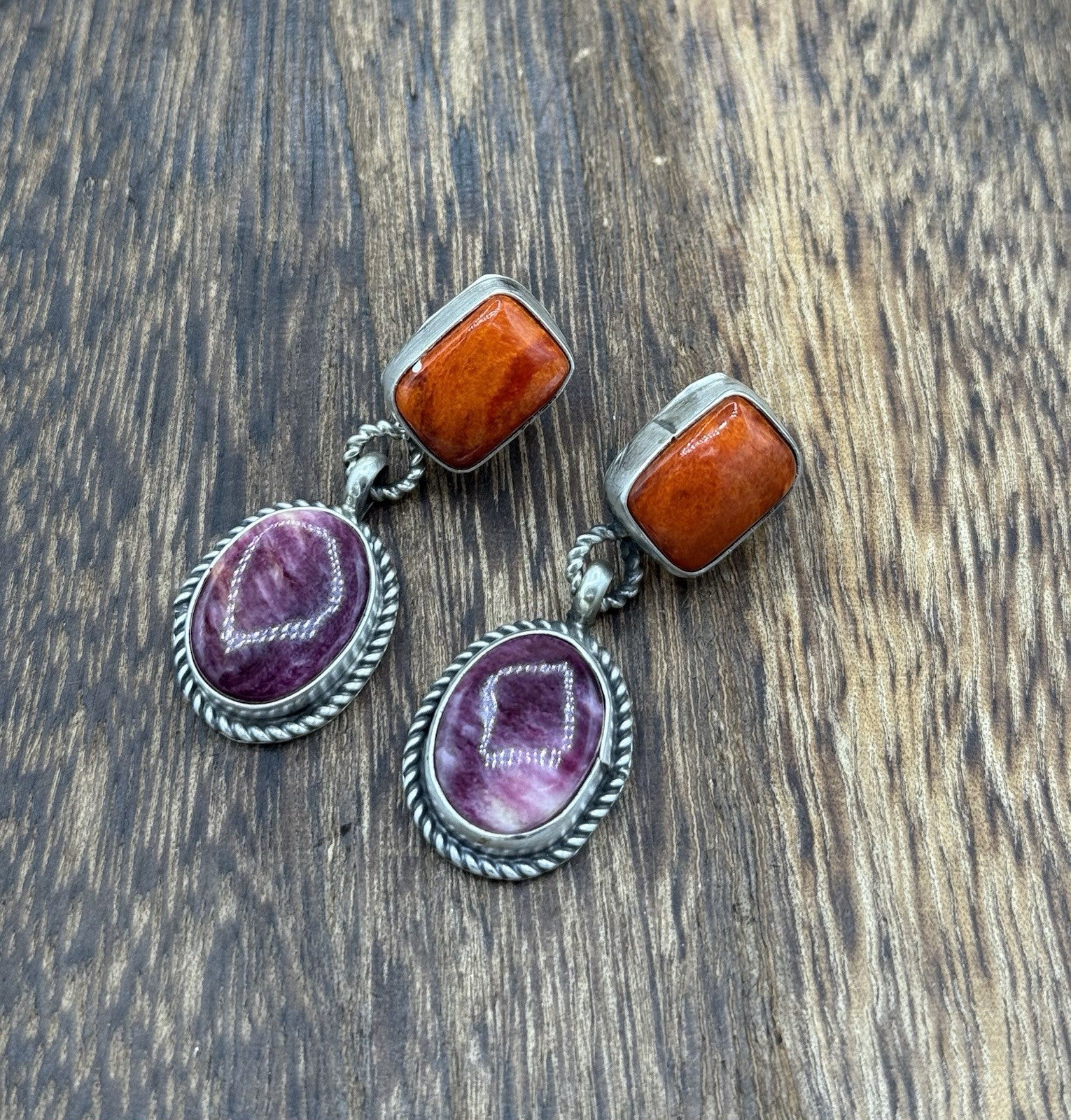 Navajo Handmade Sterling Silver Mixed Spiny Oyster Shell Post Dangle Earrings