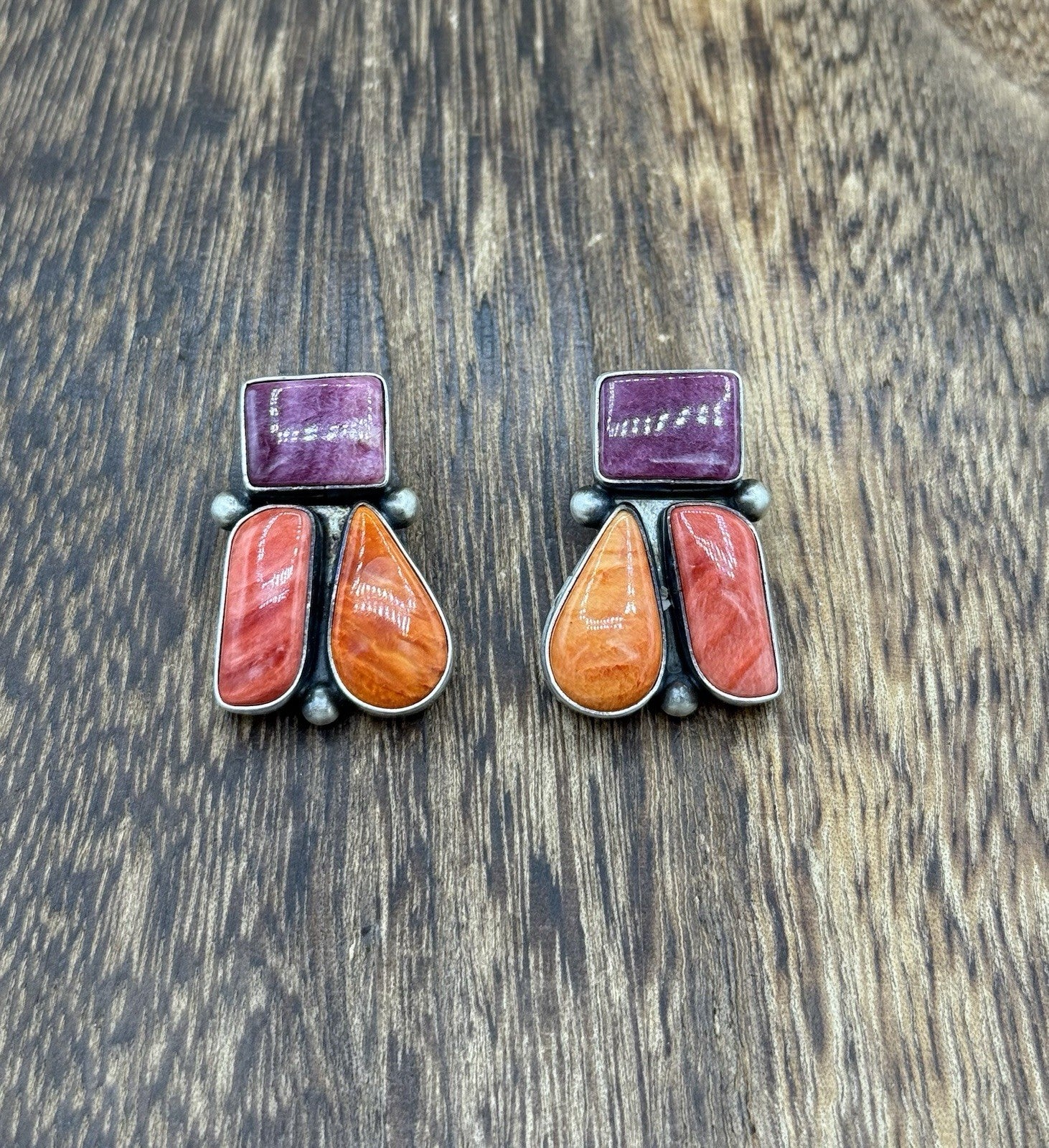 Navajo Handmade Sterling Silver Multi Color Spiny Oyster Shell Cluster Earrings