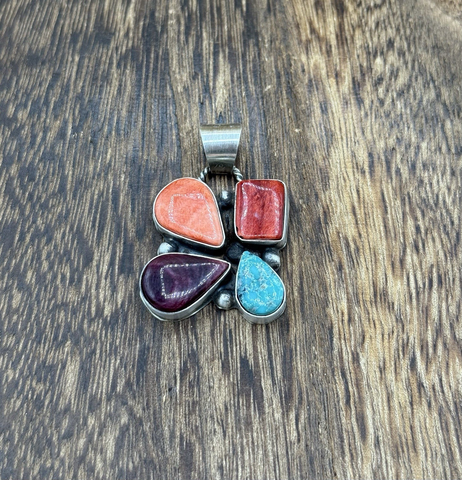 Navajo Handmade Sterling Silver Multi Color Turquoise Spiny Cluster Pendant
